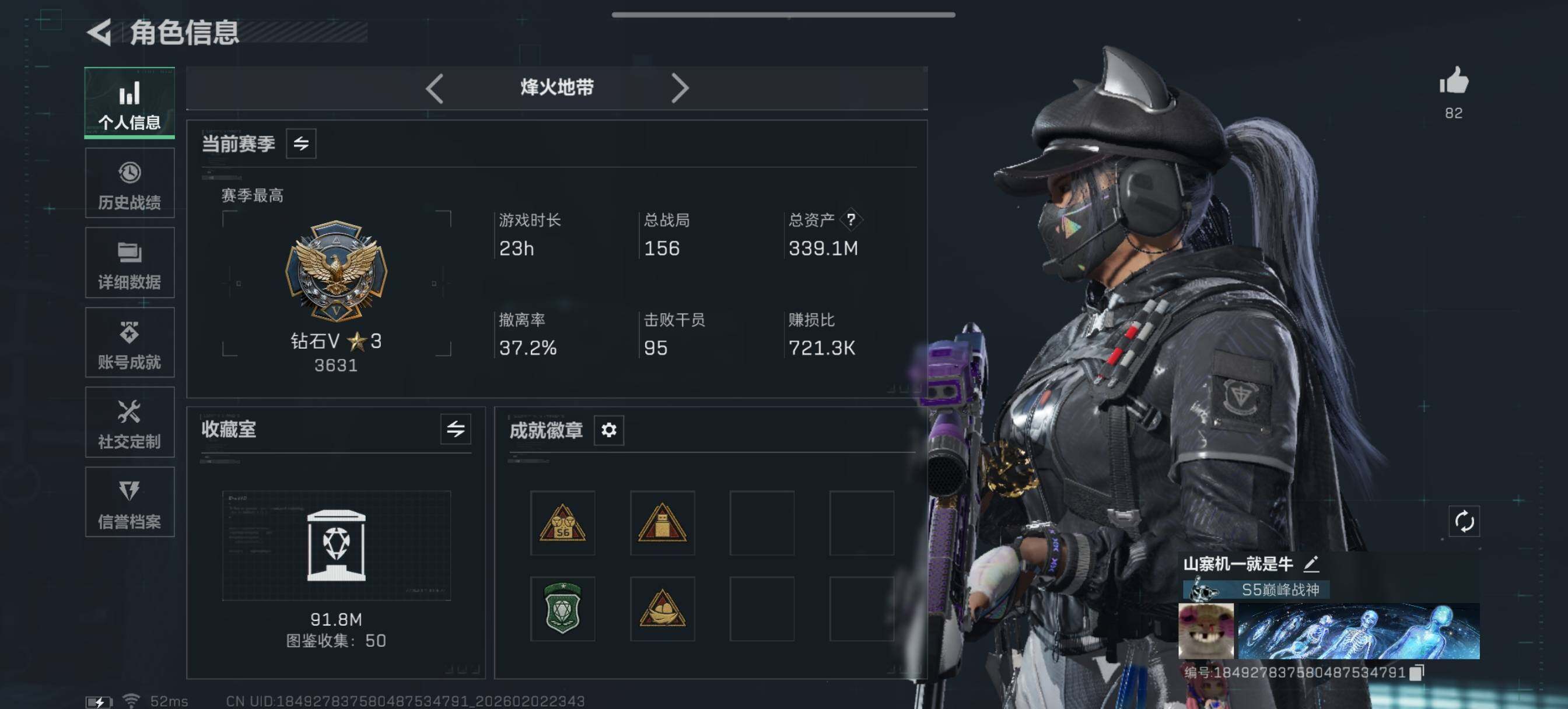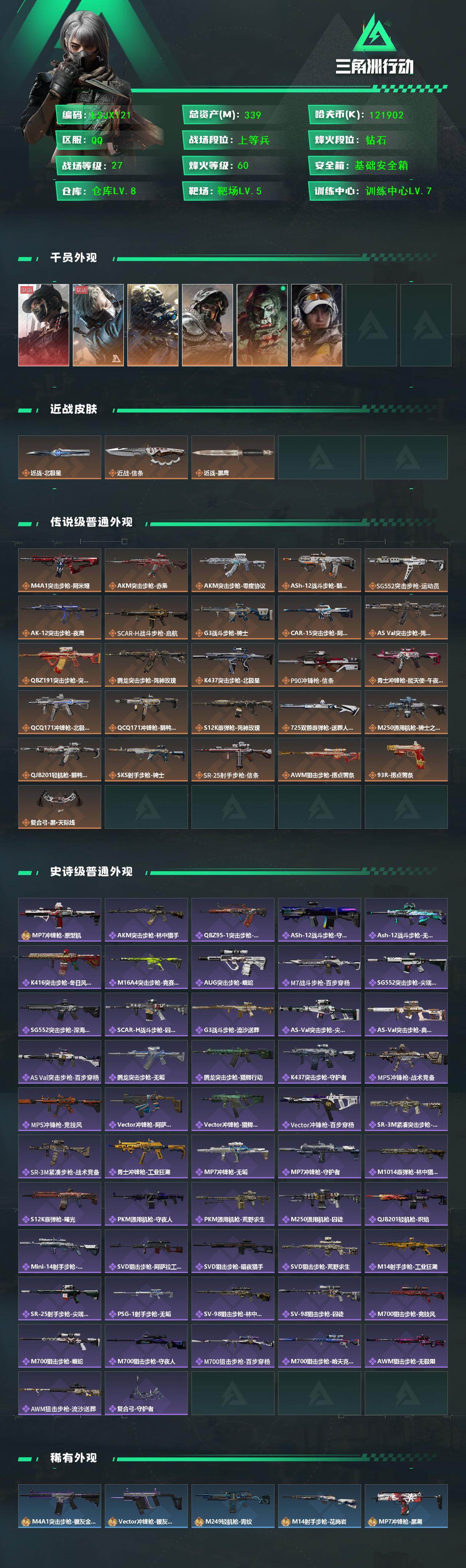 [16353625]【特价出售/店主推荐】339m总资产-121902k哈伏币-60烽火等级-钻石-27战场等级-上等兵 【干员外观】:露娜-黑·天际线,蜂医-送葬人·无题密令,无名-夜鹰,深蓝-不破誓约,红狼-电锯惊魂,露娜-金牌射手 【近战皮肤】:近战-北极星,近战-信条,近战-黑鹰 【传说外观】:M4A1突击步枪-阿米娅,AKM突击步枪-赤枭,AKM突击步枪-零度协议,ASh-12战斗步枪-鹅鸭杀,SG552突击步枪-运动员,AK-12突击步枪-夜鹰,SCAR-H战斗步枪-启航,G3战斗步枪-骑士,CAR-15突击步枪-阿米娅,AS Val突击步枪-死神玫瑰,腾龙突击步枪-捞点薯条,腾龙突击步枪-死神玫瑰,K437突击步枪-北极星,P90冲锋枪-信条,勇士冲锋枪-能天使-午夜邮差,QCQ171冲锋枪-北极星,QCQ171冲锋枪-鹅鸭杀,S12K霰弹枪-死神玫瑰,725双管霰弹枪-送葬人-无题密令,M250通用机枪-骑士之心,QJB201轻机枪-鹅鸭杀,SKS射手步枪-骑士,SR-25射手步枪-信条,AWM狙击步枪-捞点薯条,93R-捞点薯条,复合弓-黑·天际线 【史诗外观】:MP7冲锋枪-原型机*2,AKM突击步枪-林中猎手,QBZ95-1突击步枪-曙光,ASh-12战斗步枪-守夜人,ASh-12战斗步枪-无极限,K416突击步枪-冬日风情,M16A4突击步枪-竞赛选手,AUG突击步枪-蝮蛇,M7战斗步枪-百步穿杨,SG552突击步枪-尖端治疗,SG552突击步枪-深海恐惧,SCAR-H战斗步枪-囚徒,G3战斗步枪-流沙送葬,AS Val突击步枪-尖端治疗,AS Val突击步枪-典狱官,AS Val突击步枪-百步穿杨,腾龙突击步枪-无垢,腾龙突击步枪-猎鳄行动,K437突击步枪-守护者,MP5冲锋枪-战术竞备,MP5冲锋枪-竞技风,Vector冲锋枪-阿萨拉文明,Vector冲锋枪-猎鳄行动,Vector冲锋枪-百步穿杨,SR-3M紧凑突击步枪-荒野求生,SR-3M紧凑突击步枪-战术竞备,勇士冲锋枪-工业狂潮,MP7冲锋枪-无垢,MP7冲锋枪-守护者,M1014霰弹枪-林中猎手,S12K霰弹枪-曙光,PKM通用机枪-守夜人,PKM通用机枪-荒野求生,M250通用机枪-囚徒,QJB201轻机枪-炽焰,Mini-14射手步枪-守护者,SVD狙击步枪-阿萨拉工艺,SVD狙击步枪-暗夜