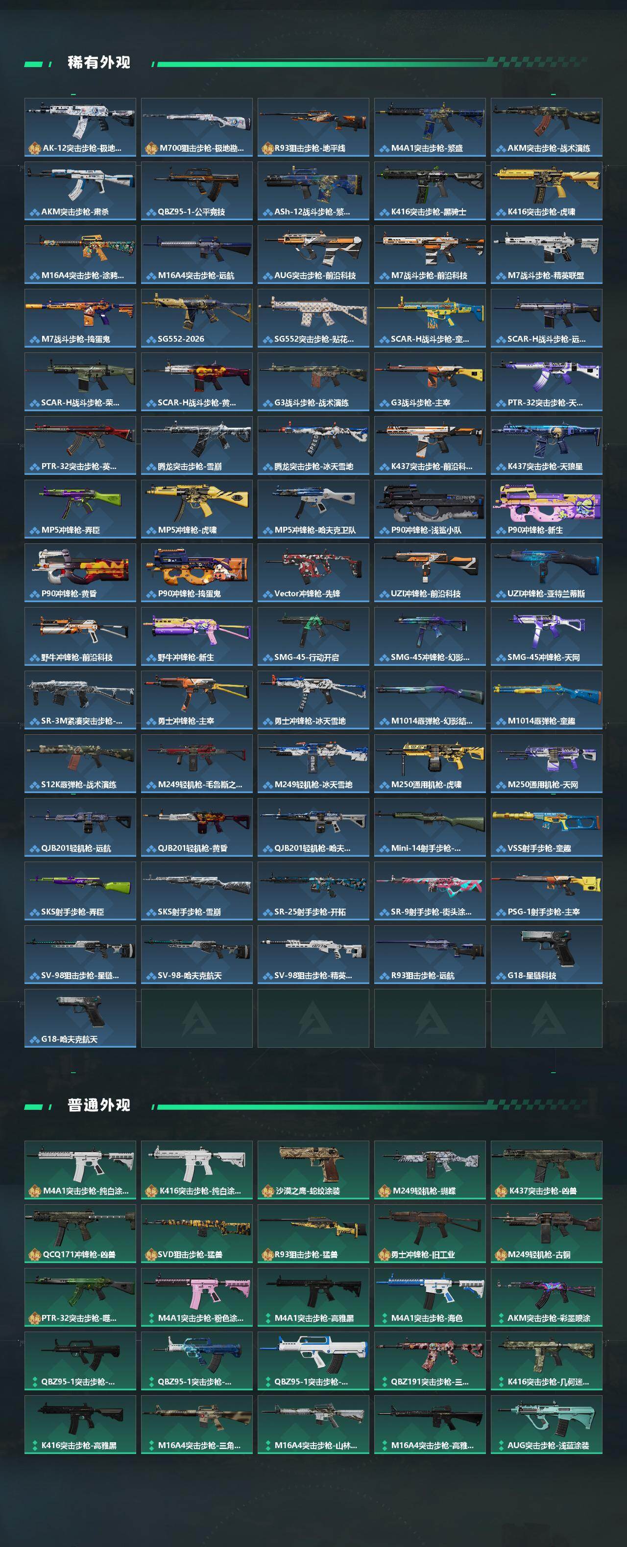【传说外观】:M4A1突击步枪-阿米娅,AKM突击步枪-赤枭,AKM突击步枪-零度协议,ASh-12战斗步枪-鹅鸭杀,SG552突击步枪-运动员,AK-12突击步枪-夜鹰,SCAR-H战斗步枪-启航,G3战斗步枪-骑士,CAR-15突击步枪-阿米娅,AS Val突击步枪-死神玫瑰,腾龙突击步枪-捞点薯条,腾龙突击步枪-死神玫瑰,K437突击步枪-北极星,P90冲锋枪-信条,勇士冲锋枪-能天使-午夜邮差,QCQ171冲锋枪-北极星,QCQ171冲锋枪-鹅鸭杀,S12K霰弹枪-死神玫瑰,725双管霰弹枪-送葬人-无题密令,M250通用机枪-骑士之心,QJB201轻机枪-鹅鸭杀,SKS射手步枪-骑士,SR-25射手步枪-信条,AWM狙击步枪-捞点薯条,93R-捞点薯条,复合弓-黑·天际线