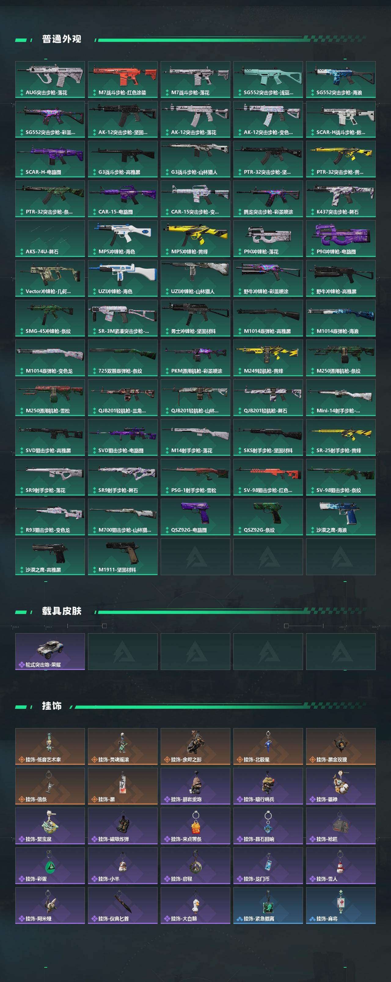 【史诗外观】:MP7冲锋枪-原型机*2,AKM突击步枪-林中猎手,QBZ95-1突击步枪-曙光,ASh-12战斗步枪-守夜人,ASh-12战斗步枪-无极限,K416突击步枪-冬日风情,M16A4突击步枪-竞赛选手,AUG突击步枪-蝮蛇,M7战斗步枪-百步穿杨,SG552突击步枪-尖端治疗,SG552突击步枪-深海恐惧,SCAR-H战斗步枪-囚徒,G3战斗步枪-流沙送葬,AS Val突击步枪-尖端治疗,AS Val突击步枪-典狱官,AS Val突击步枪-百步穿杨,腾龙突击步枪-无垢,腾龙突击步枪-猎鳄行动,K437突击步枪-守护者,MP5冲锋枪-战术竞备,MP5冲锋枪-竞技风,Vector冲锋枪-阿萨拉文明,Vector冲锋枪-猎鳄行动,Vector冲锋枪-百步穿杨,SR-3M紧凑突击步枪-荒野求生,SR-3M紧凑突击步枪-战术竞备,勇士冲锋枪-工业狂潮,MP7冲锋枪-无垢,MP7冲锋枪-守护者,M1014霰弹枪-林中猎手,S12K霰弹枪-曙光,PKM通用机枪-守夜人,PKM通用机枪-荒野求生,M250通用机枪-囚徒,QJB201轻机枪-炽焰,Mini-14射手步枪-守护者,SVD狙击步枪-阿萨拉工艺,SVD狙击步枪-暗夜