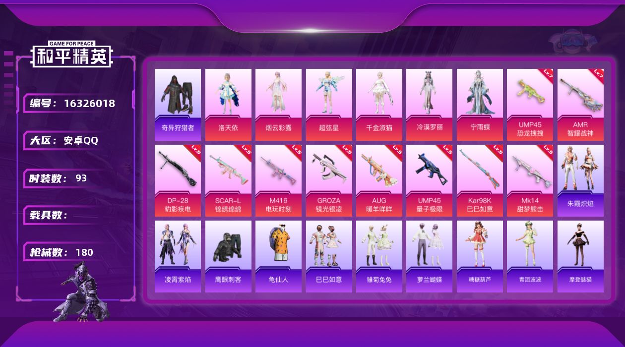 [16326018]【特价出售/店主推荐】安卓 手Q-6粉装-10特效枪-0载具-3粉色飞行器-52296热力值-10王牌印记-93套装-180枪皮【热门品类】:套装-奇异狩猎者,套装-龟仙人【粉色套装】:角色-洛天依,角色-烟云彩露,角色-超弦星,角色-千金淑猫,角色-冷漠罗丽,角色-宁雨蝶【粉色枪皮等级】:SCAR-L-锦绣绵绵(五级),M416-电玩时刻(五级),GROZA-镜光银凌(五级),AUG-暖羊咩咩(五级),UMP45-恐龙拽拽(七级),UMP45-量子极限(五级),Kar98K-巳巳如意(五级),Mk14-甜梦熊击(五级),AMR-智耀战神(七级),DP-28-豹影疾电(五级)【粉色枪皮】:SCAR-L-锦绣绵绵,M416-电玩时刻,GROZA-镜光银凌,AUG-暖羊咩咩,UMP45-恐龙拽拽,UMP45-量子极限,Kar98K-巳巳如意,Mk14-甜梦熊击,AMR-智耀战神,DP-28-豹影疾电【粉色飞行器】:时空协奏飞行器,极意拳锋飞行器