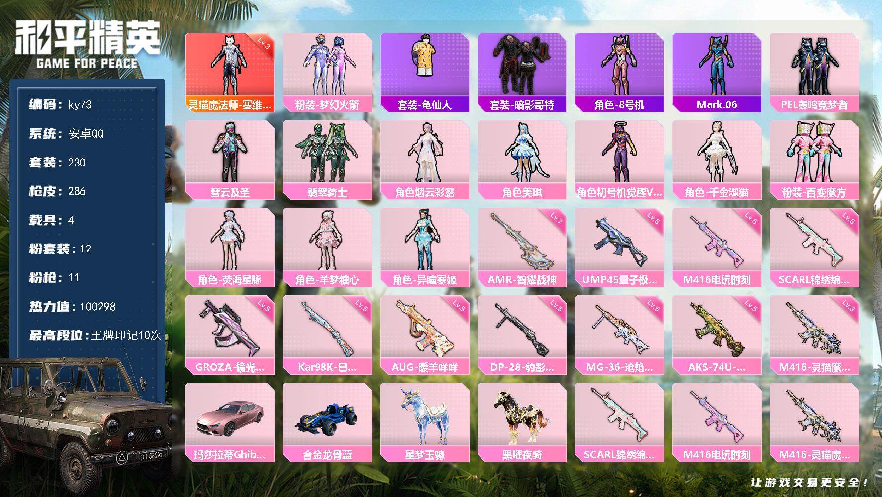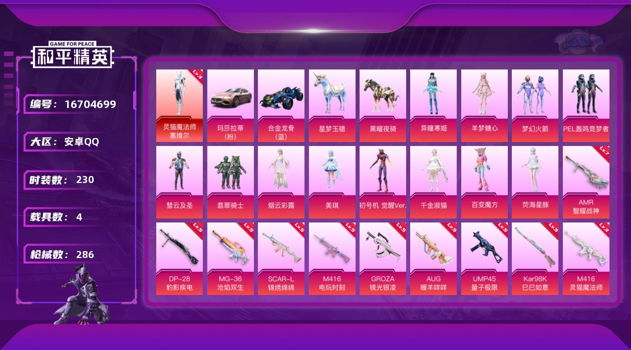 [16704699]安卓 手Q-1神装-12粉装-11特效枪-4载具-7粉色飞行器-100298热力值-10王牌印记-230套装-286枪皮