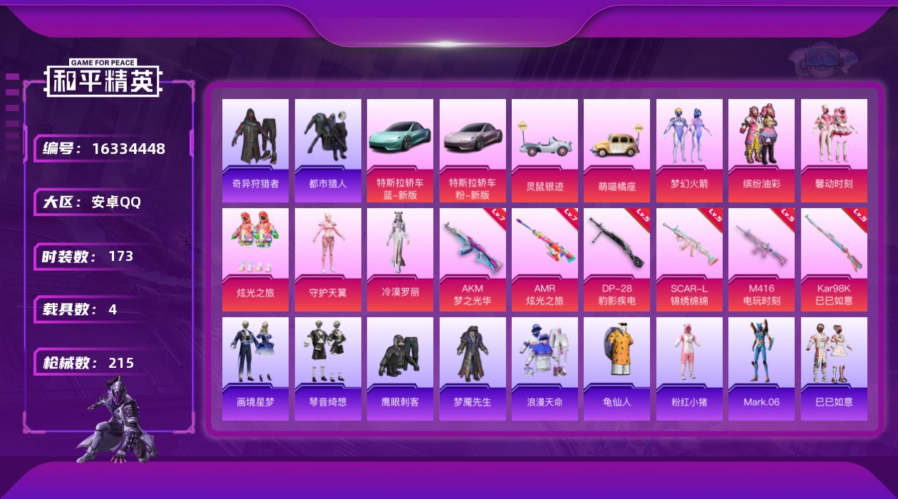 [16334448]【特价出售/店主推荐】安卓 手Q-6粉装-6特效枪-4载具-2粉色飞行器-7.2w热力值-14王牌印记-173套装-215枪皮