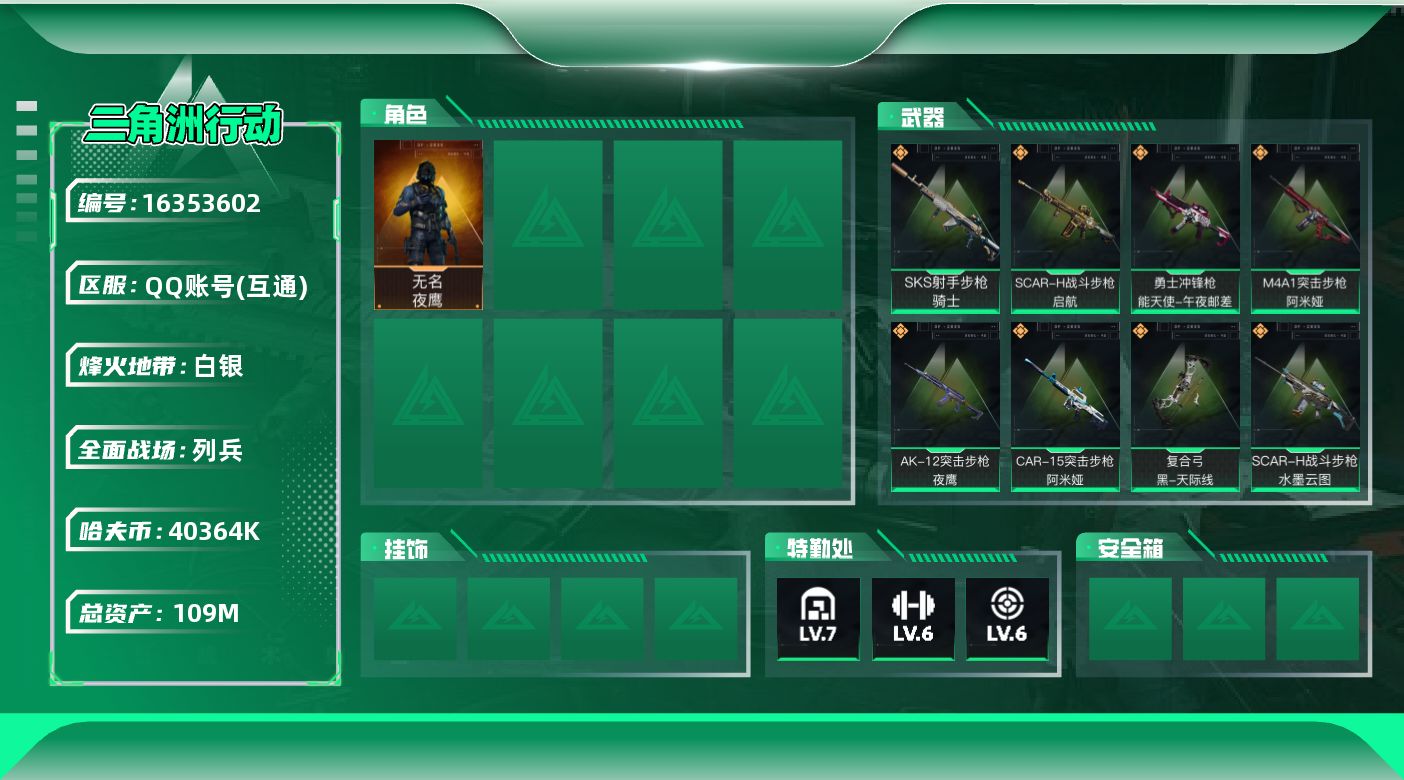 [16353602]【特价出售/店主推荐】109m总资产-40364k哈伏币-60烽火等级-白银-6战场等级-列兵 【干员外观】:无名-夜鹰 【近战皮肤】:近战-黑鹰 【传说外观】:M4A1突击步枪-阿米娅,AK-12突击步枪-夜鹰,SCAR-H战斗步枪-水墨云图,SCAR-H战斗步枪-启航,CAR-15突击步枪-阿米娅,SMG-45冲锋枪-骑士,勇士冲锋枪-能天使-午夜邮差,SKS射手步枪-骑士,复合弓-黑·天际线 【史诗外观】:Vector冲锋枪-潜袭者,AKM突击步枪-林中猎手,QBZ95-1突击步枪-曙光,ASh-12战斗步枪-守夜人,K416突击步枪-冬日风情,K416突击步枪-阿萨拉特攻,AUG突击步枪-蝮蛇,SG552突击步枪-尖端治疗,SG552突击步枪-深海恐惧,AS Val突击步枪-尖端治疗,腾龙突击步枪-猎鳄行动,腾龙突击步枪-聚光灯,MP5冲锋枪-深海恐惧,Vector冲锋枪-阿萨拉文明,Vector冲锋枪-猎鳄行动,SR-3M紧凑突击步枪-纷争,SR-3M紧凑突击步枪-战术竞备,勇士冲锋枪-深海恐惧,M1014霰弹枪-林中猎手,PKM通用机枪-守夜人,SVD狙击步枪-阿萨拉工艺,SR-25射手步枪-尖端治疗,SV-98狙击步枪-林中猎手,M700狙击步枪-蝮蛇,M700狙击步枪-守夜人,沙漠之鹰-曙光 【稀有外观】:M14射手步枪-天际线,ASh-12战斗步枪-星链科技,ASh-12战斗步枪-哈夫克航天,K416突击步枪-碳纤维,M16A4突击步枪-远航,M7战斗步枪-捣蛋鬼,SG552突击步枪-2026,AK-12突击步枪-零点,SCAR-H战斗步枪-童趣,SCAR-H战斗步枪-远航,SCAR-H战斗步枪-荣耀列队,PTR-32突击步枪-英雄,腾龙突击步枪-冰天雪地,MP5冲锋枪-弄臣,MP5冲锋枪-哈夫克卫队,P90冲锋枪-浅鲨小队,P90冲锋枪-新生,P90冲锋枪-捣蛋鬼,Vector冲锋枪-先锋,Vector冲锋枪-街头涂鸦,Vector冲锋枪-行动开启,野牛冲锋枪-前沿科技,野牛冲锋枪-新生,SMG-45冲锋枪-前沿科技,SMG-45冲锋枪-哈夫克卫队,SMG-45-行动开启,SMG-45冲锋枪-幻影结构,勇士冲锋枪-冰天雪地,MP7冲锋枪-幻影结构,M1014霰弹枪-幻影结构,M1014霰弹枪-童趣,PKM通用机枪-英雄,M249轻机枪-毛鲁斯之