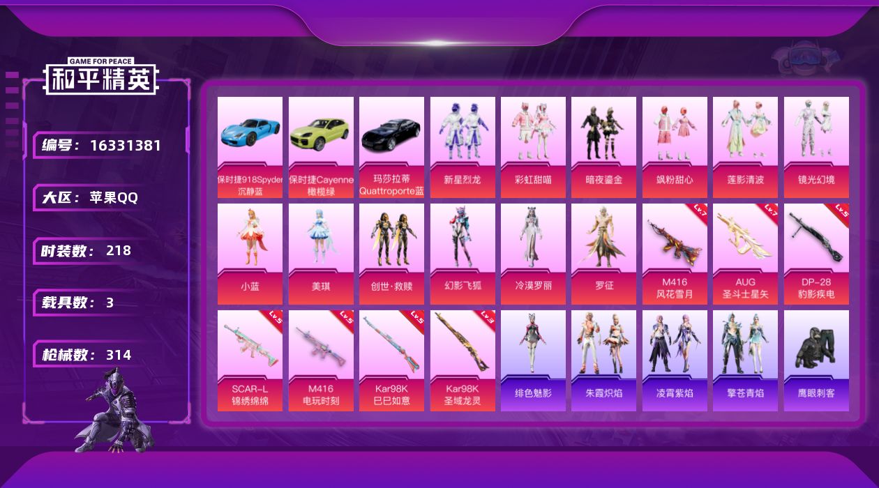 [16331381]【特价出售/店主推荐】苹果 手Q-12粉装-7特效枪-3载具-6粉色飞行器-101674热力值-17王牌印记-218套装-314枪皮 【热门品类】:角色-军刀雅典娜,套装-龟仙人,套装-粉红小猪,角色-8号机,角色-Mark.06 【粉色套装】:粉装-新星烈龙,粉装-彩虹甜喵,粉装-暗夜鎏金,粉装-飒粉甜心,粉装-莲影清波,粉装-镜光幻境,角色-小蓝,角色-美琪,套装-创世·救赎,粉装-幻影飞狐,角色-冷漠罗丽,角色-罗征 【粉色枪皮等级】:SCAR-L-锦绣绵绵(五级),M416-风花雪月(七级),M416-电玩时刻(五级),AUG-圣斗士星矢(七级),Kar98K-巳巳如意(五级),Kar98K-圣域龙灵(三级),DP-28-豹影疾电(五级) 【粉色载具】:玛莎拉蒂Quattroporte(夜幕蓝),保时捷918 Spyder(沉静蓝),保时捷Cayenne(橄榄绿) 【粉色枪皮】:SCAR-L-锦绣绵绵,M416-风花雪月,M416-电玩时刻,AUG-圣斗士星矢,Kar98K-巳巳如意,Kar98K-圣域龙灵,DP-28-豹影疾电 【粉色飞行器】:太空嘟嘟飞行器,镜域双华-灵镜之阶,龙翔九天飞行器,深渊漩涡飞行器,雀灵庇佑飞行器 【粉色降落伞】:星之彼岸降落伞,暗夜玫瑰降落伞,垂柳戏鸭降落伞,飒粉甜心降落伞,未来歌姬降落伞,炫光之旅降落伞,莲影清波降落伞,镜光幻境降落伞,圣堂之誓降落伞,精灵梦叶罗丽降落伞,墨龙九天降落伞,初号机 觉醒Ver.降落伞,金丰海韵降落伞,鬼刀降落伞,圣域龙灵降落伞,星穹咏叹调降落伞,幻彩电音降落伞,炫彩糖果降落伞 【稀有套装】:套装-龟仙人,套装-巳巳如意,套装-小鸟芋圆,套装-炫彩糖果,套装-雏菊兔兔,套装-萝兰蝴蝶,角色-狂花道·雅典娜,套装-糖糖葫芦,套装-青团波波,套装-棉花软糖,角色-俏兔智灵,套装-燕燕于飞,套装-鱼渊荷华,套装-樱梦幻音,套装-粉恋花,套装-紫幽梦,套装-蓝冰羽,角色-幽澜祭司,套装-星影赞美诗,套装-极速光影,套装-彩虹兔,套装-云朵鹅,套装-雪绒豹,套装-蓝海鲸歌,套装-朱霞炽焰,套装-凌霄紫焰,套装-擎苍青焰,角色-绯色魅影 【稀有枪皮】:AUG-冰晶雪宝,AKM-彩虹符号,AKM-影袭,AKM-星兔领航员,AKM-破晓战魂,AKM-萌趣颜团子,AKM-虎虎生威,AKM-霓虹街区,AKM-龙的传