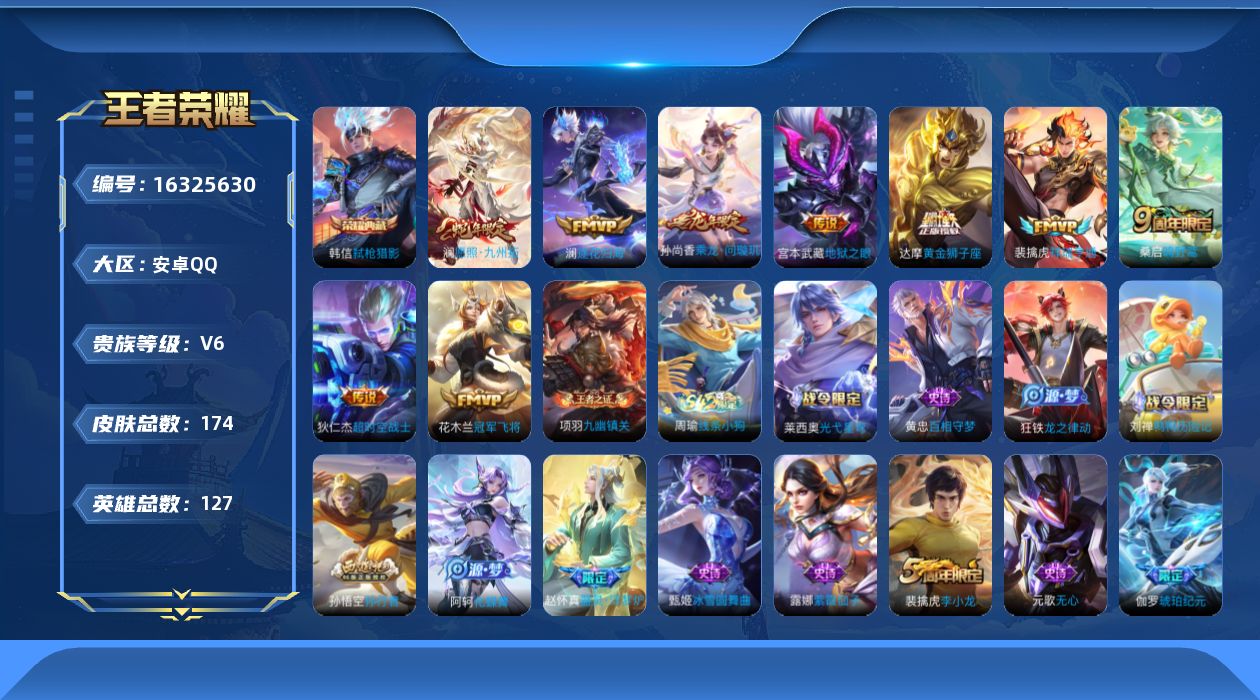[16325630]【特价出售/店主推荐】安卓Q-V6-至尊星耀IV段位-127英雄-174皮肤-1典藏皮肤-9传说-42史诗