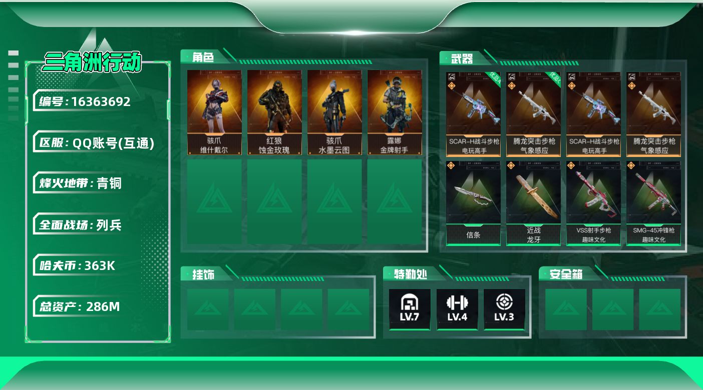 [16363692]2典藏砖皮【特价出售/店主推荐】286m总资产-363k哈伏币-60烽火等级-青铜-8战场等级-列兵 【干员外观】:红狼-蚀金玫瑰,骇爪-水墨云图,骇爪-维什戴尔,露娜-金牌射手 【近战皮肤】:近战-信条,近战-龙牙,近战-黑鹰 【典藏外观】:SCAR-H战斗步枪-电玩高手,腾龙突击步枪-气象感应 【典藏外观成色】:SCAR-H战斗步枪-电玩高手(优品A),腾龙突击步枪-气象感应(优品C) 【传说外观】:M4A1突击步枪-蚀金玫瑰,AKM突击步枪-零度协议,SG552突击步枪-运动员,AK-12突击步枪-纵横,SCAR-H战斗步枪-水墨云图,P90冲锋枪-信条,SMG-45冲锋枪-趣味文化,勇士冲锋枪-能天使-午夜邮差,MP7冲锋枪-趣味文化,M250通用机枪-纵横,SKS射手步枪-骑士,SR-25射手步枪-信条,杠杆式步枪-纵横,VSS射手步枪-趣味文化,R93狙击步枪-维什戴尔 【史诗外观】:QBZ95-1突击步枪-曙光,K416突击步枪-冬日风情,AUG突击步枪-蝮蛇,M7战斗步枪-百步穿杨,G3战斗步枪-流沙送葬,AS Val突击步枪-百步穿杨,Vector冲锋枪-百步穿杨,Vector冲锋枪-异域战争,S12K霰弹枪-曙光,SVD狙击步枪-阿萨拉工艺,M14射手步枪-工业狂潮,M700狙击步枪-百步穿杨,M700狙击步枪-哈夫克警备,AWM狙击步枪-流沙送葬 【稀有外观】:As Val突击步枪-星之彩,PKM通用机枪-黑潮,SG552突击步枪-天际线,沙漠之鹰-天际线,S12K霰弹枪-海岸线,PKM通用机枪-精湛工艺,Mini-14射手步枪-精湛工艺,SKS射手步枪-精湛工艺,R93狙击步枪-精湛工艺,R93狙击步枪-地平线,UZI冲锋枪-旧梦*2,AUG突击步枪-旧梦,SR-3M紧凑突击步枪-巨兽*3,M14射手步枪-巨兽*3,K437突击步枪-巨兽*2,M4A1突击步枪-繁盛,ASh-12战斗步枪-繁盛,SG552突击步枪-2026,SCAR-H战斗步枪-荣耀列队,G3战斗步枪-主宰,PTR-32突击步枪-天网,MP5冲锋枪-哈夫克卫队,UZI冲锋枪-亚特兰蒂斯,SMG-45-行动开启,勇士冲锋枪-主宰,勇士冲锋枪-冰天雪地,MP7冲锋枪-钢铁之躯,M1014霰弹枪-幻影结构,M249轻机枪-毛鲁斯之力,M249轻机枪-冰天雪地,QJB201轻机枪-
