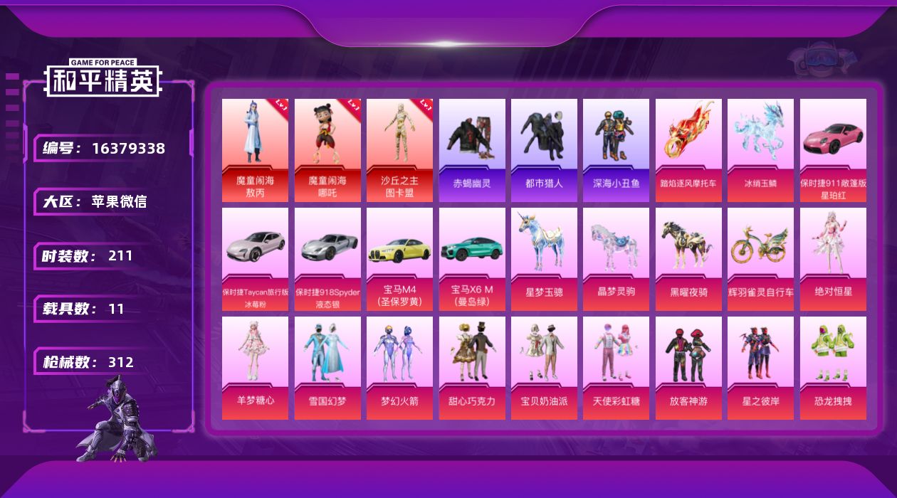 [16379338]【店主推荐捡漏号!可直接换绑】苹果 微信-4神装-32粉装-31特效枪-11载具-21粉色飞行器-124149热力值-7王牌印记-211套装-312枪皮【红色神装等级】:暮色玫影-艾丽娅(二级),魔童闹海-敖丙(一级),魔童闹海-哪吒(一级),沙丘之主-图卡盟(一级)【红色角色神装】:暮色玫影-艾丽娅,魔童闹海-敖丙,魔童闹海-哪吒,沙丘之主-图卡盟【热门品类】:粉装-雪国幻梦,粉装-梦幻火箭,套装-浪漫天命,套装-赤蝎幽灵,套装-都市猎人,套装-深海小丑鱼,套装-小丑鱼,套装-暗夜行者,角色-2B战斗服款,套装-暗影哥特,套装-软软马卡龙,角色-六号稻草人【粉色套装】:角色-绝对恒星,粉装-甜心巧克力,粉装-宝贝奶油派,粉装-天使彩虹糖,粉装-雪国幻梦,粉装-梦幻火箭,粉装-放客神游,粉装-星之彼岸,粉装-恐龙拽拽,角色-复仇流浪者,粉装-旋转彩虹,粉装-冰川幽秘,粉装-冰川红玫,粉装-第五大道,粉装-仲夏莫吉托,粉装-拂晓神骑,角色-星云暗核,角色-千金淑猫,角色-萨利娅,角色-樱桃泡泡,粉装-雪月幻音,角色-智耀战神,粉装-幻彩电音,角色-时光之吻,角色-狂魅哈莉,角色-冷漠罗丽,角色-宁雨蝶,角色-罗征,角色-荧海星豚,角色-绯穹魔姬,角色-奇迹舞步 美雪,角色-羊梦糖心【粉色枪皮等级】:AKM-幽焰骑士(三级),SCAR-L-魔童闹海 哪吒(三级),M416-风花雪月(三级),M416-灵猫魔法师(三级),GROZA-巴啦啦小魔仙(三级),GROZA-镜光银凌(五级),AUG-星梦奇缘(六级),AUG-暖羊咩咩(五级),M762-冷魅冰骑(一级),蜜獾-荧海星豚(五级),ARX-无垠阁(三级),UMP45-恐龙拽拽(二级),Vector-最终圣卫者(三级),Vector-绯穹魔姬(一级),AKS-74U-无垠阁(五级),P90-魔童闹海 敖丙(三级),Kar98K-巳巳如意(五级),Mk14-樱桃泡泡(三级),AMR-智耀战神(四级),M417-第五大道(一级),MK12-雪月幻音(五级),M249-绝对恒星(一级),DP-28-豹影疾电(五级),MG-36-幻彩电音(四级),MG-36-沧焰双生(五级),平底锅-仲夏莫吉托(一级),平底锅-喜羊羊与灰太狼(二级),烟雾弹-电雾迷城(一级),燃烧瓶-薄荷可可(四级),破片手榴弹-美味星星糖(六级)【粉色载