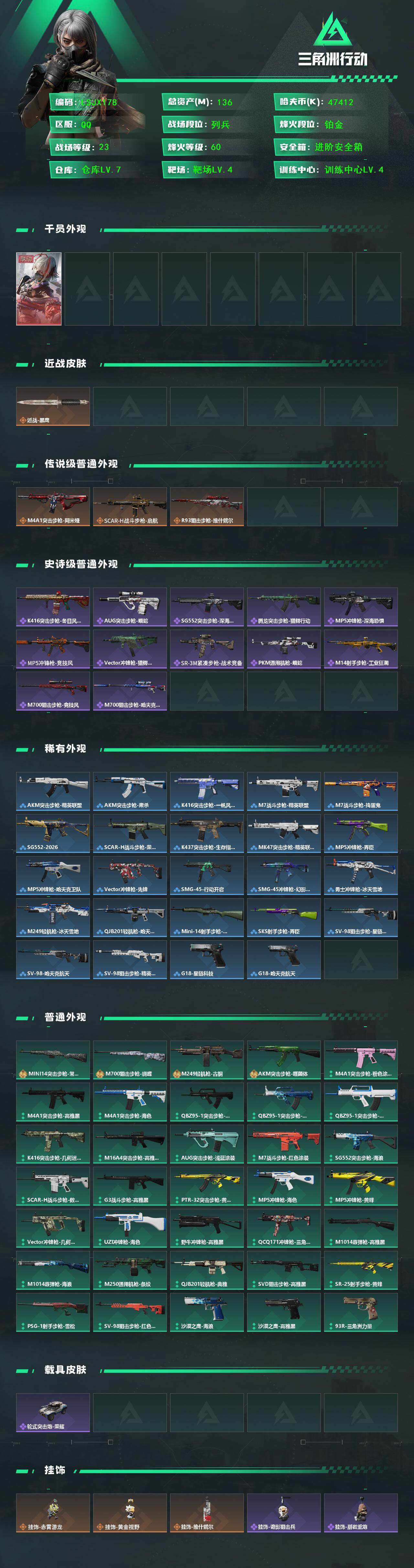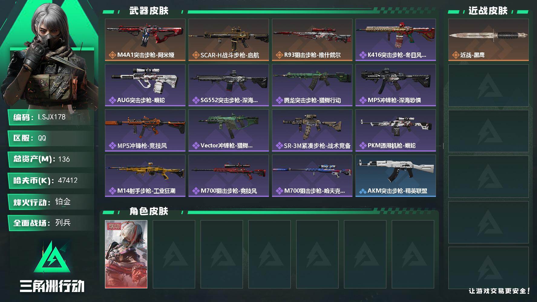 [16667642]【特价出售/店主推荐】136m总资产-47412k哈伏币-60烽火等级-铂金-23战场等级-列兵 【干员外观】:骇爪-维什戴尔 【近战皮肤】:近战-黑鹰 【传说外观】:M4A1突击步枪-阿米娅,SCAR-H战斗步枪-启航,R93狙击步枪-维什戴尔 【史诗外观】:K416突击步枪-冬日风情,AUG突击步枪-蝮蛇,SG552突击步枪-深海恐惧,腾龙突击步枪-猎鳄行动,MP5冲锋枪-深海恐惧,MP5冲锋枪-竞技风,Vector冲锋枪-猎鳄行动,SR-3M紧凑突击步枪-战术竞备,PKM通用机枪-蝮蛇,M14射手步枪-工业狂潮,M700狙击步枪-竞技风,M700狙击步枪-哈夫克警备 【稀有外观】:AKM突击步枪-精英联盟,AKM突击步枪-肃杀,K416突击步枪-一帆风顺,M7战斗步枪-精英联盟,M7战斗步枪-捣蛋鬼,SG552突击步枪-2026,SCAR-H战斗步枪-荣耀列队,K437突击步枪-生存指令,MK47突击步枪-精英联盟,MP5冲锋枪-弄臣,MP5冲锋枪-哈夫克卫队,Vector冲锋枪-先锋,SMG-45-行动开启,SMG-45冲锋枪-幻影结构,勇士冲锋枪-冰天雪地,M249轻机枪-冰天雪地,QJB201轻机枪-哈夫克卫队,Mini-14射手步枪-荣耀列队,SKS射手步枪-弄臣,SV-98狙击步枪-星链科技,SV-98狙击步枪-哈夫克航天,SV-98狙击步枪-精英联盟,G18-星链科技,G18-哈夫克航天 【普通外观】:Mini-14射手步枪-常青藤,M700狙击步枪-蝴蝶,M249轻机枪-古铜,AKM突击步枪-噬菌体,M4A1突击步枪-粉色涂装,M4A1突击步枪-高雅黑,M4A1突击步枪-海色,QBZ95-1突击步枪-高雅黑,QBZ95-1突击步枪-海浪,QBZ95-1突击步枪-海色,QBZ95-1突击步枪-2026,K416突击步枪-几何迷彩,M16A4突击步枪-高雅黑,AUG突击步枪-浅蓝涂装,M7战斗步枪-红色涂装,SG552突击步枪-海浪,SCAR-H战斗步枪-数码迷彩,G3战斗步枪-高雅黑,PTR-32突击步枪-黄蜂,MP5冲锋枪-海色,MP5冲锋枪-黄蜂,Vector冲锋枪-几何迷彩,UZI冲锋枪-海色,野牛冲锋枪-高雅黑,QCQ171冲锋枪-三角洲力量,M1014霰弹枪-高雅黑,M1014霰弹枪-海浪,M250通用机枪-条纹,QJB201轻机枪-典