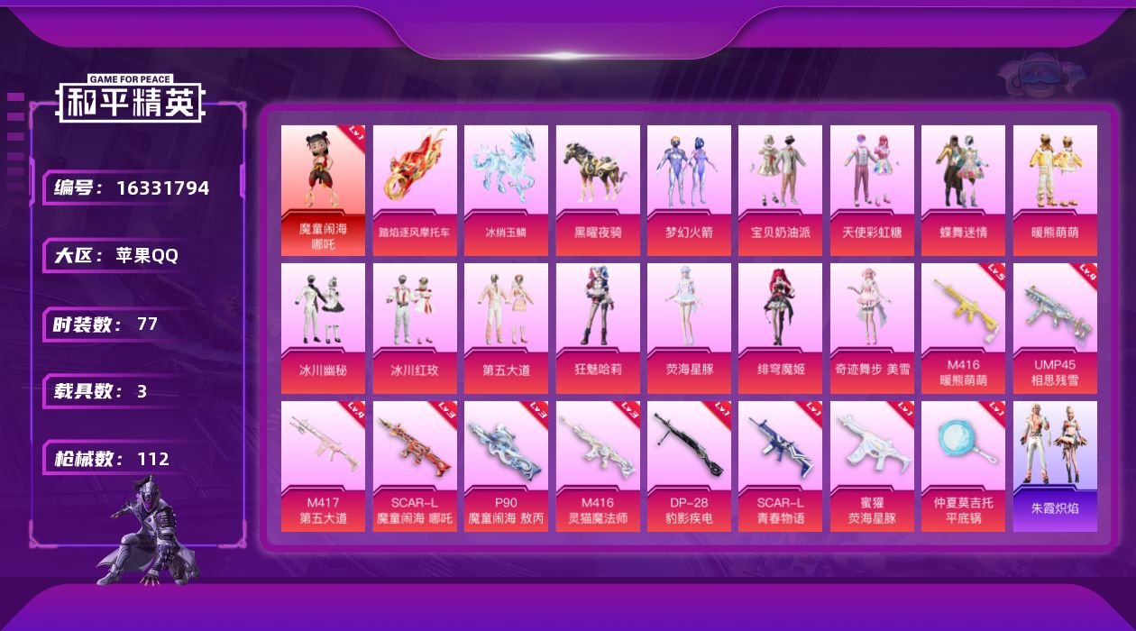 [16331794]苹果 手Q-1神装-12粉装-10特效枪-3载具-1僚机-6粉色飞行器-40452热力值-4王牌印记-77套装-112枪皮