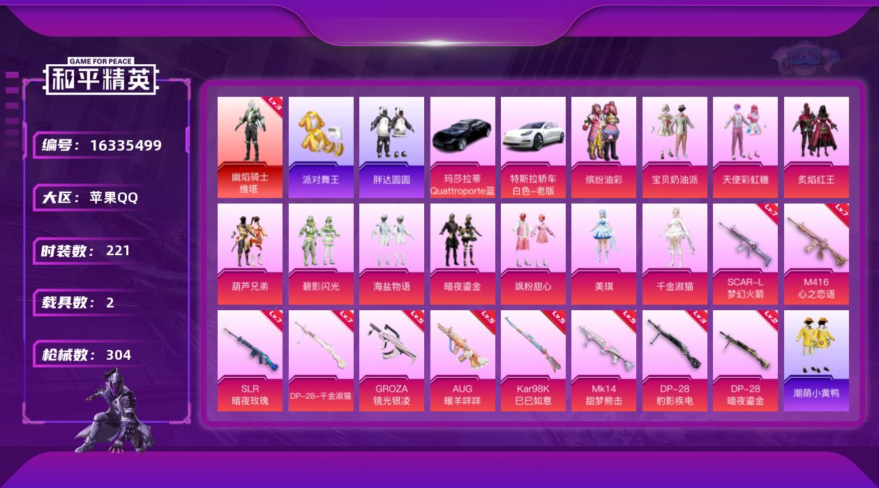 [16335499]【店主推荐捡漏号!可直接换绑】苹果 手Q-1神装-12粉装-10特效枪-2载具-4粉色飞行器-10w热力值-22王牌印记-221套装-304枪皮