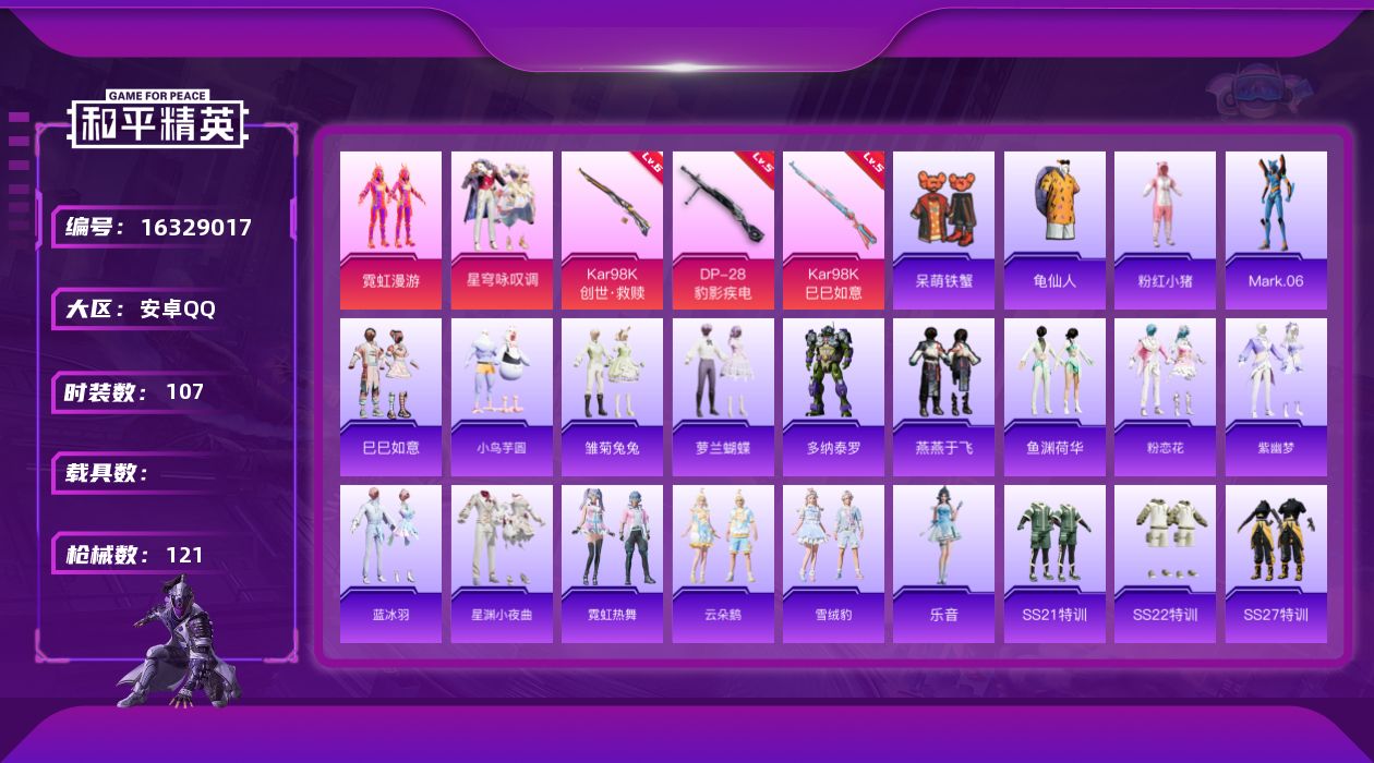 - PX_2090812-安卓手Q-4王牌印记-1粉装-1特效枪-1载具-25290热力值-72套装-89枪皮-0卓越印记-0传奇印记 【1粉装】,垂柳戏鸭 【1特效枪】Kar98K-巳巳如意-5级 【2稀有紫装】,龟仙人,许七安, 【1稀有载具】,幻影随行, 【72稀有时装】,SS31特训,SS33特训,SS32特训,恋语绒绒,SS34特训,龟仙人,许七安,龙魂突击队,SS30特训,战术大师,智谋