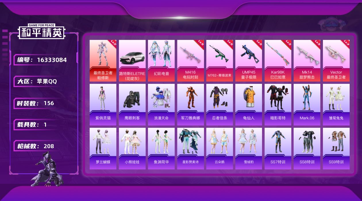 [16333084]【店主推荐捡漏号!可直接换绑】苹果 手Q-1神装-1粉装-6特效枪-1载具-2粉色飞行器-6.3w热力值-13王牌印记-156套装-208枪皮