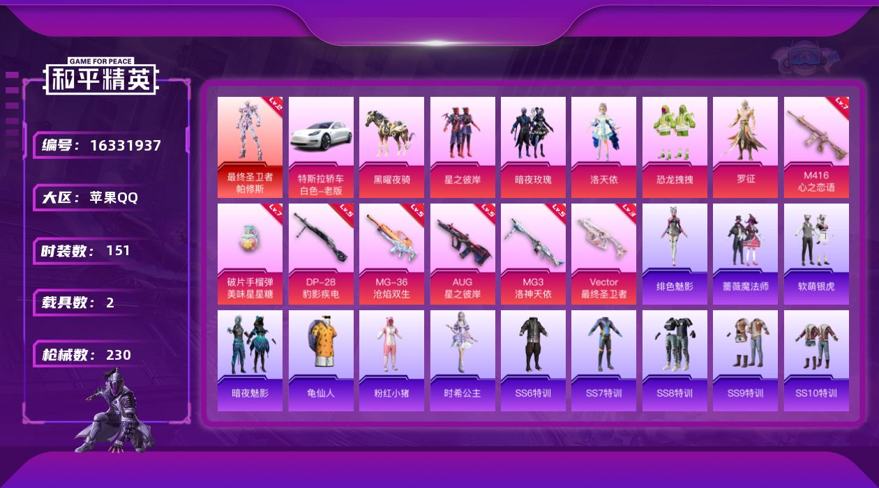 [16331937]【特价出售/店主推荐】 苹果 手Q-1神装-5粉装-7特效枪-2载具-3粉色飞行器-7.3w热力值-11王牌印记-151套装-230枪皮【红色神装等级】:最终圣卫者-帕修斯(二级)【红色角色神装】:最终圣卫者-帕修斯【热门品类】:套装-龟仙人,套装-粉红小猪【粉色套装】:粉装-星之彼岸,粉装-暗夜玫瑰,角色-洛天依,粉装-恐龙拽拽,角色-罗征【粉色枪皮等级】:M416-心之恋语(七级),AUG-星之彼岸(五级),Vector-最终圣卫者(三级),DP-28-豹影疾电(五级),MG3-洛神天依(五级),MG-36-沧焰双生(五级),破片手榴弹-美味星星糖(七级)【粉色载具】:特斯拉Model 3(珍珠白),黑曜夜骑【粉色枪皮】:M416-心之恋语,AUG-星之彼岸,Vector-最终圣卫者,DP-28-豹影疾电,MG3-洛神天依,MG-36-沧焰双生,破片手榴弹-美味星星糖【粉色飞行器】:星之彼岸飞行器,终晖之翼飞行器,灵猫魔法师飞行器