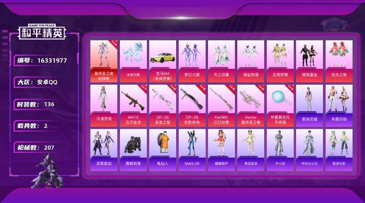 [16331977]【特价出售/店主推荐】安卓 手Q-1神装-8粉装-6特效枪-2载具-4粉色飞行器-7w热力值-6王牌印记-136套装-207枪皮