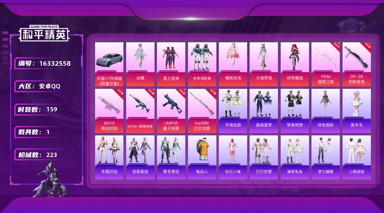 [16332558]【店主推荐捡漏号!可直接换绑】安卓 手Q-7粉装-6特效枪-1载具-1粉色飞行器-68112热力值-15王牌印记-159套装-223枪皮【热门品类】:套装-龟仙人,套装-粉红小猪【粉色套装】:粉装-星之彼岸,粉装-未来领航者,角色-樱桃泡泡,角色-冷漠罗丽,角色-绯穹魔姬,角色-冰魄【粉色枪皮等级】:M416-电玩时刻(五级),M762-青锋波束(五级),UMP45-量子极限(五级),Kar98K-巳巳如意(五级),DP-28-豹影疾电(五级),PKM-江南烟雨(七级)【粉色载具】:仰望U7(阿盖尔紫)【粉色枪皮】:M416-电玩时刻,M762-青锋波束,UMP45-量子极限,Kar98K-巳巳如意,DP-28-豹影疾电,PKM-江南烟雨