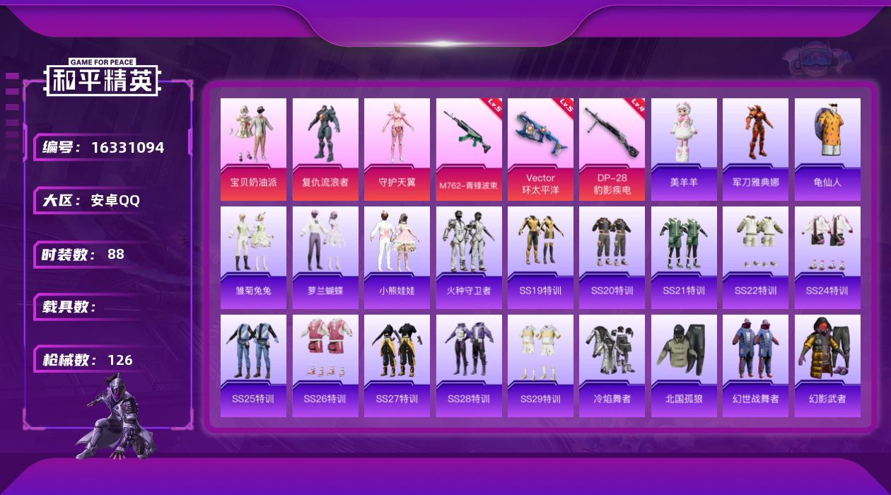 [16331094]【特价出售/店主推荐】 安卓 手Q-4粉装-3特效枪-0载具-2粉色飞行器-3.4w热力值-2王牌印记-88套装-126枪皮【热门品类】:角色-军刀雅典娜,套装-龟仙人【粉色套装】:粉装-宝贝奶油派,角色-复仇流浪者,角色-守护天翼,角色-罪夜之冕【粉色枪皮等级】:M762-青锋波束(五级),Vector-环太平洋(五级),DP-28-豹影疾电(四级)【粉色枪皮】:M762-青锋波束,Vector-环太平洋,DP-28-豹影疾电【粉色飞行器】:绒雪飘舞飞行器,黄族统领飞行器