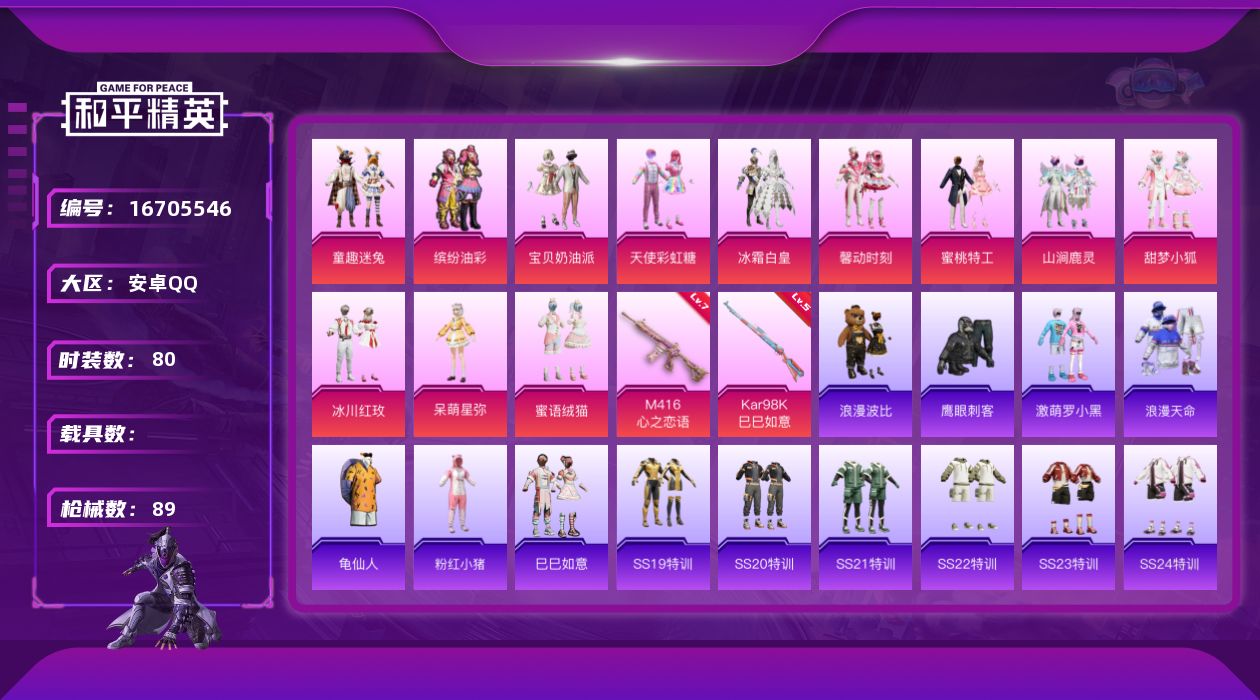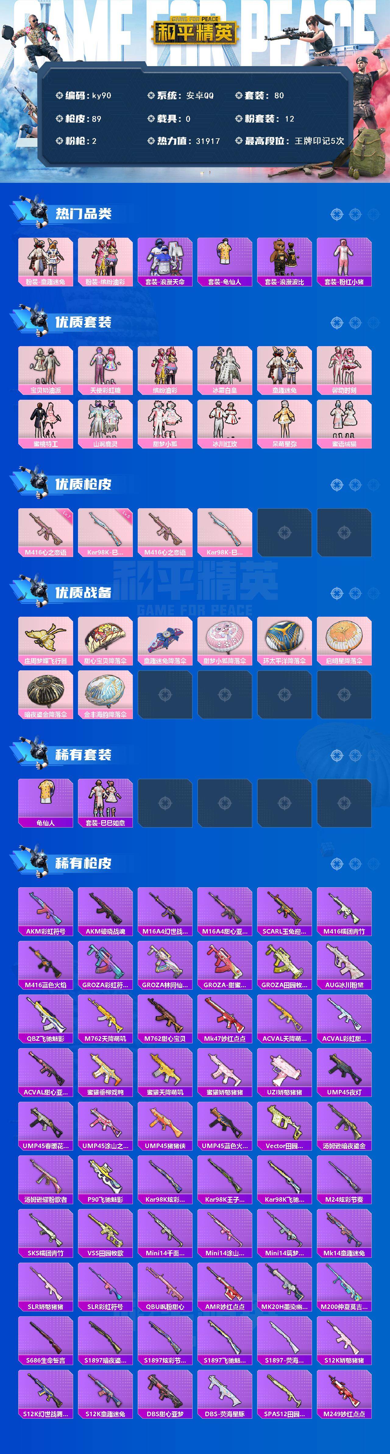 [16705546]安卓 手Q-12粉装-2特效枪-0载具-1粉色飞行器-31917热力值-5王牌印记-80套装-89枪皮 【热门品类】:粉装-童趣迷兔,粉装-缤纷油彩,套装-浪漫天命,套装-龟仙人,套装-浪漫波比,套装-粉红小猪 【粉色套装】:粉装-宝贝奶油派,粉装-天使彩虹糖,粉装-缤纷油彩,粉装-冰霜白皇,粉装-童趣迷兔,粉装-馨动时刻,粉装-蜜桃特工,粉装-山涧鹿灵,粉装-甜梦小狐,粉装-冰川红玫,角色-呆萌星弥,粉装-蜜语绒猫 【粉色枪皮等级】:M416-心之恋语(七级),Kar98K-巳巳如意(五级) 【粉色枪皮】:M416-心之恋语,Kar98K-巳巳如意 【粉色飞行器】:庄周梦蝶飞行器 【粉色降落伞】:甜心宝贝降落伞,童趣迷兔降落伞,甜梦小狐降落伞,环太平洋降落伞,启明星降落伞,暗夜鎏金降落伞,金丰海韵降落伞 【稀有套装】:套装-龟仙人,套装-巳巳如意 【稀有枪皮】:AKM-彩虹符号,AKM-破晓战魂,M16A4-幻世战舞者,M16A4-甜心亚梦,SCAR-L-玉兔迎春,M416-糯团青竹,M416-蓝色火焰,GROZA-彩虹符号,GROZA-林间仙鹿,GROZA-甜蜜草莓,GROZA-田园牧歌,AUG-冰川粉黛,QBZ-飞驰魅影,M762-天降萌叽,M762-甜心宝贝,Mk47-妙红点点,AC-VAL-天降萌叽,AC-VAL-彩虹甜喵,AC-VAL-甜心亚梦,蜜獾-垂柳戏鸭,蜜獾-天降萌叽,蜜獾-娇憨猪猪,UZI-娇憨猪猪,UMP45-夜灯,UMP45-春暖花开,UMP45-涂山之恋,UMP45-猪猪侠,UMP45-蓝色火焰,Vector-田园牧歌,汤姆逊-暗夜鎏金,汤姆逊-耀粉歌者,P90-飞驰魅影,Kar98K-炫彩节奏,Kar98K-王子的夏天,Kar98K-飞驰魅影,M24-炫彩节奏,SKS-糯团青竹,VSS-田园牧歌,Mini14-千面幻镜,Mini14-涂山之恋,Mini14-筑梦精灵,Mk14-童趣迷兔,SLR-娇憨猪猪,SLR-彩虹符号,QBU-飒粉甜心,AMR-妙红点点,MK20-H-墨染幽兰,M200-仲夏莫吉托,S686-生命誓言,S1897-暗夜鎏金,S1897-炫彩节奏,S1897-飞驰魅影,S1897-荧海星豚,S12K-童趣迷兔,S12K-娇憨猪猪,S12K-幻世战舞者,DBS-甜心亚梦,DBS-荧海星豚,SPAS-12-田园牧歌,M2