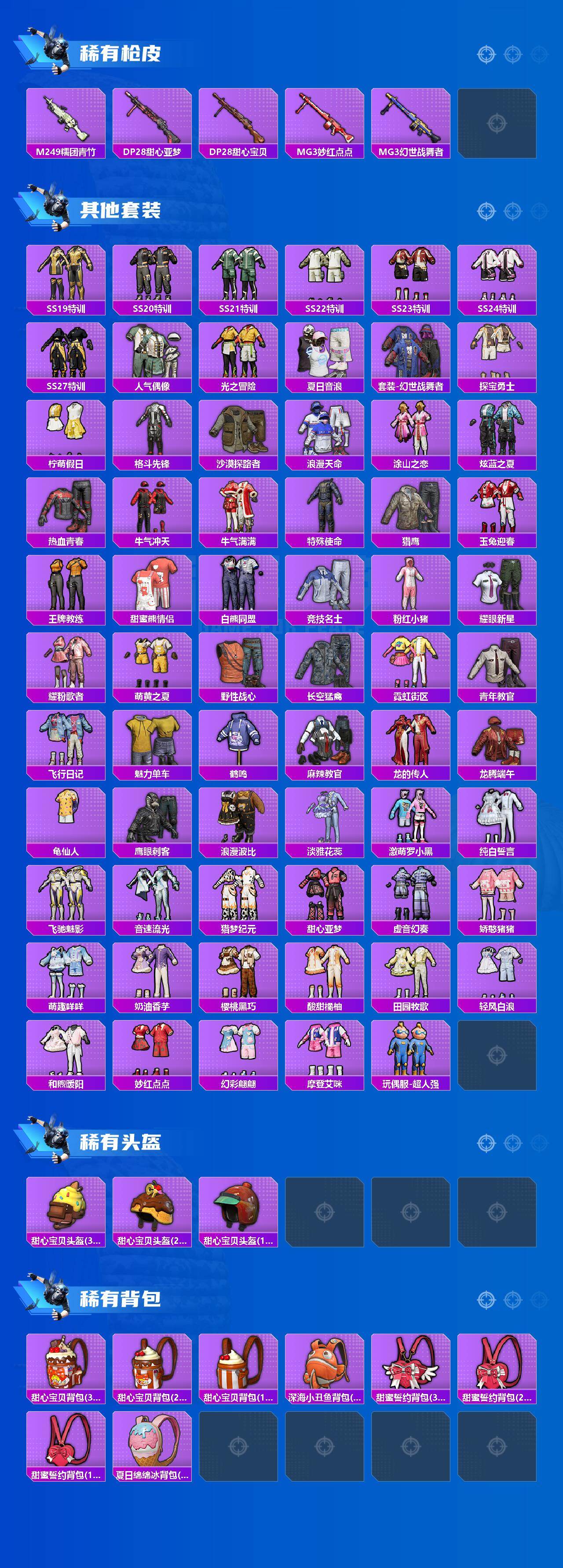 【稀有枪皮】:AKM-彩虹符号,AKM-破晓战魂,M16A4-幻世战舞者,M16A4-甜心亚梦,SCAR-L-玉兔迎春,M416-糯团青竹,M416-蓝色火焰,GROZA-彩虹符号,GROZA-林间仙鹿,GROZA-甜蜜草莓,GROZA-田园牧歌,AUG-冰川粉黛,QBZ-飞驰魅影,M762-天降萌叽,M762-甜心宝贝,Mk47-妙红点点,AC-VAL-天降萌叽,AC-VAL-彩虹甜喵,AC-VAL-甜心亚梦,蜜獾-垂柳戏鸭,蜜獾-天降萌叽,蜜獾-娇憨猪猪,UZI-娇憨猪猪,UMP45-夜灯,UMP45-春暖花开,UMP45-涂山之恋,UMP45-猪猪侠,UMP45-蓝色火焰,Vector-田园牧歌,汤姆逊-暗夜鎏金,汤姆逊-耀粉歌者,P90-飞驰魅影,Kar98K-炫彩节奏,Kar98K-王子的夏天,Kar98K-飞驰魅影,M24-炫彩节奏,SKS-糯团青竹,VSS-田园牧歌,Mini14-千面幻镜,Mini14-涂山之恋,Mini14-筑梦精灵,Mk14-童趣迷兔,SLR-娇憨猪猪,SLR-彩虹符号,QBU-飒粉甜心,AMR-妙红点点,MK20-H-墨染幽兰,M200-仲夏莫吉托,S686-生命誓言,S1897-暗夜鎏金,S1897-炫彩节奏,S1897-飞驰魅影,S1897-荧海星豚,S12K-童趣迷兔,S12K-娇憨猪猪,S12K-幻世战舞者,DBS-甜心亚梦,DBS-荧海星豚,SPAS-12-田园牧歌,M2