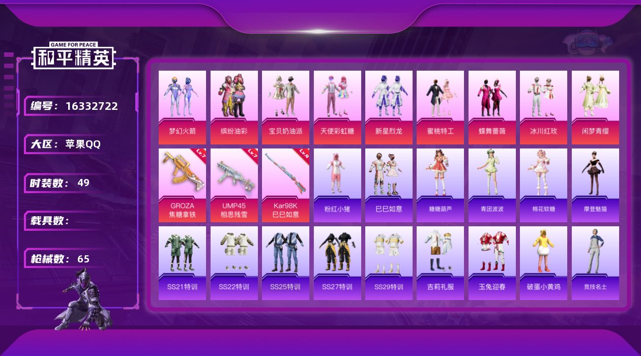 [16332722]【店主推荐捡漏号!可直接换绑】苹果 手Q-9粉装-3特效枪-0载具-1粉色飞行器-22777热力值-3王牌印记-49套装-65枪皮【热门品类】:粉装-梦幻火箭,粉装-缤纷油彩,套装-粉红小猪【粉色套装】:粉装-宝贝奶油派,粉装-天使彩虹糖,粉装-梦幻火箭,粉装-缤纷油彩,粉装-新星烈龙,粉装-蜜桃特工,粉装-蝶舞蔷薇,粉装-冰川红玫,粉装-闲梦青缨【粉色枪皮等级】:GROZA-焦糖拿铁(七级),UMP45-相思残雪(七级),Kar98K-巳巳如意(四级)【粉色枪皮】:GROZA-焦糖拿铁,UMP45-相思残雪,Kar98K-巳巳如意【粉色飞行器】:梦幻火箭飞行器
