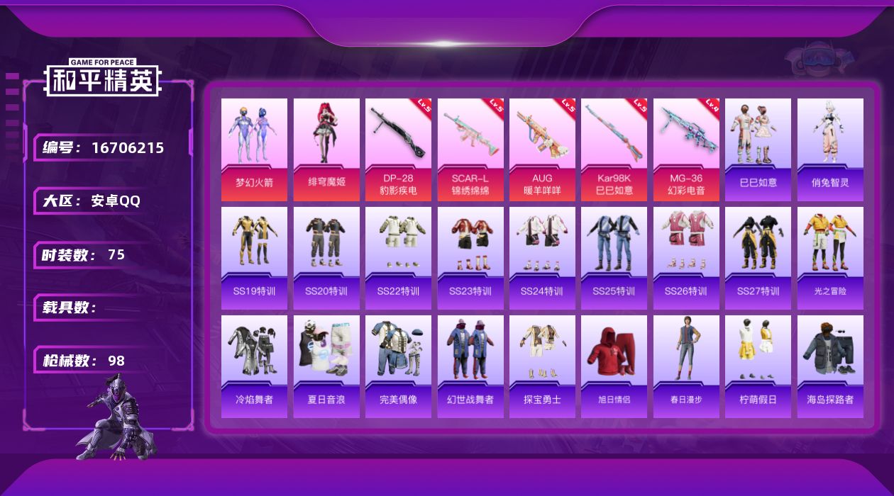 [16706215]安卓 手Q-2粉装-5特效枪-0载具-0粉色飞行器-26144热力值-4王牌印记-75套装-98枪皮