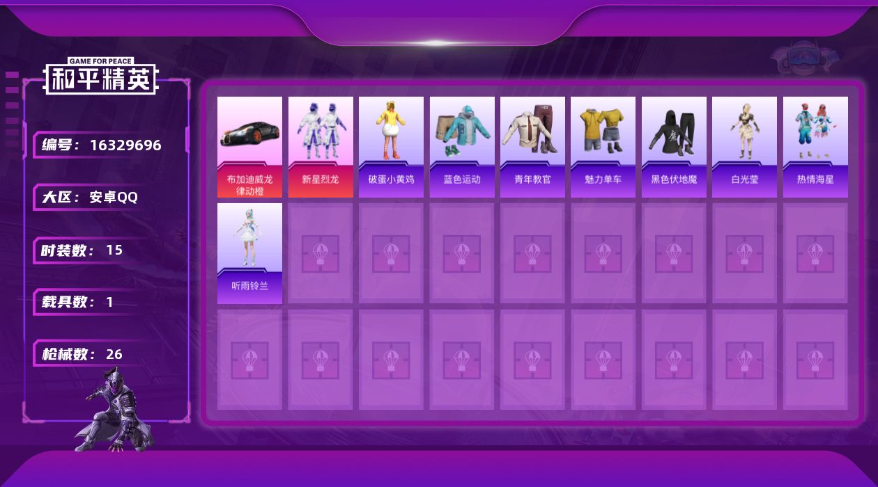 [16329696]【特价出售/店主推荐】安卓 手Q-1粉装-1特效枪-1载具-0粉色飞行器-7720热力值-1王牌印记-15套装-26枪皮 【粉色套装】:粉装-新星烈龙 【粉色载具】:布加迪威龙(律动橙) 【粉色枪皮】:AUG-罪夜之冕 【粉色降落伞】:至尊龙雀降落伞,精灵梦叶罗丽降落伞,鸢尾晶梦降落伞 【稀有枪皮】:SCAR-L-炫彩节奏,M762-天降萌叽,M762-风花雪月,UZI-天降萌叽,SKS-炫彩节奏,Mini14-炫彩节奏,S686-奇异狩猎者,DP-28-彩虹符号 【其他套装】:套装-破蛋小黄鸡,套装-蓝色运动,套装-青年教官,套装-魅力单车,套装-黑色伏地魔,角色-白光莹,套装-热情海星,角色-听雨铃兰 【营地ID】:967478488
