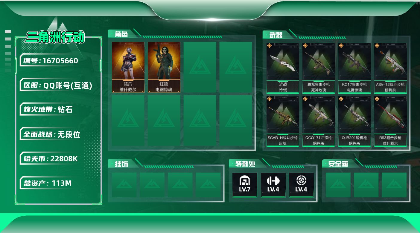 [16705660]可二次【店主推荐捡漏号】113m总资产-22808k哈伏币-60烽火等级-钻石-1战场等级-无军衔 【干员外观】:骇爪-维什戴尔,红狼-电锯惊魂 【近战皮肤】:近战-怜悯,近战-黑鹰 【传说外观】:M4A1突击步枪-阿米娅,ASh-12战斗步枪-鹅鸭杀,M16A4突击步枪-狩猎时刻,SCAR-H战斗步枪-启航,G3战斗步枪-狩猎时刻,腾龙突击步枪-死神玫瑰,KC17突击步枪-电锯惊魂,Vector冲锋枪-狩猎时刻,勇士冲锋枪-能天使-午夜邮差,QCQ171冲锋枪-鹅鸭杀,QJB201轻机枪-鹅鸭杀,R93狙击步枪-维什戴尔 【史诗外观】:MP5冲锋枪-战术竞备,MP5冲锋枪-竞技风,SR-3M紧凑突击步枪-战术竞备,勇士冲锋枪-工业狂潮,SVD狙击步枪-阿萨拉工艺,SV-98狙击步枪-林中猎手 【稀有外观】:AKM突击步枪-肃杀,QBZ95-1突击步枪-公平竞技,M7战斗步枪-捣蛋鬼,SCAR-H战斗步枪-荣耀列队,腾龙突击步枪-冰天雪地,MP5冲锋枪-弄臣,MP5冲锋枪-哈夫克卫队,P90冲锋枪-黄昏,P90冲锋枪-精英联盟,Vector冲锋枪-先锋,UZI冲锋枪-亚特兰蒂斯,SMG-45-行动开启,勇士冲锋枪-精英联盟,QJB201轻机枪-哈夫克卫队,Mini-14射手步枪-荣耀列队,SKS射手步枪-弄臣,SV-98狙击步枪-星链科技,SV-98狙击步枪-哈夫克航天,SV-98狙击步枪-精英联盟,G18-星链科技,G18-哈夫克航天 【普通外观】:AK-12突击步枪-旧工业,QBZ95-1突击步枪-高雅黑,QBZ191突击步枪-三角洲力量,K416突击步枪-几何迷彩,M16A4突击步枪-山林猎人,SCAR-H战斗步枪-数码迷彩,G3战斗步枪-高雅黑,PTR-32突击步枪-黄蜂,MP5冲锋枪-海色,M1014霰弹枪-高雅黑,PKM通用机枪-彩墨喷涂,M250通用机枪-条纹,QJB201轻机枪-三角洲力量,SVD狙击步枪-高雅黑,QSZ92G-条纹,沙漠之鹰-海浪,沙漠之鹰-高雅黑 【载具外观】:轮式突击炮-荣耀 【挂饰】:挂饰-窃风密探,挂饰-维什戴尔,挂饰-阿萨拉狙击兵*2,挂饰-诡影狙击兵,挂饰-诡影喷火兵*2,挂饰-崩岩重炮*5,挂饰-暗行哨兵*3,挂饰-狩猎时刻,挂饰-启程,挂饰-猎杀本能,挂饰-阿萨拉徽章*8
