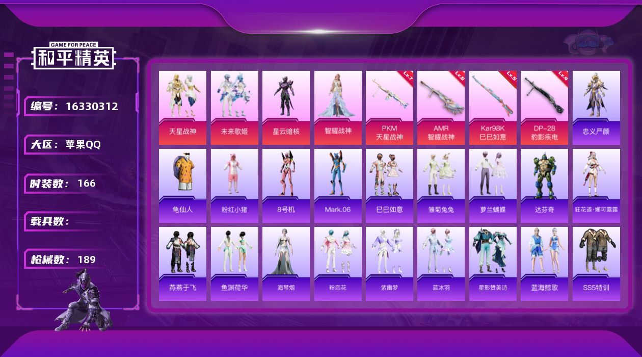 [16330312]【特价出售/店主推荐】苹果 手Q-4粉装-4特效枪-0载具-0粉色飞行器-61211热力值-9王牌印记-166套装-189枪皮