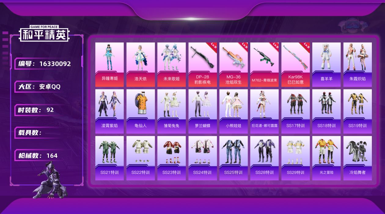 [16330092]【特价出售/店主推荐】安卓 手Q-3粉装-4特效枪-0载具-1粉色飞行器-46841热力值-1王牌印记-92套装-164枪皮