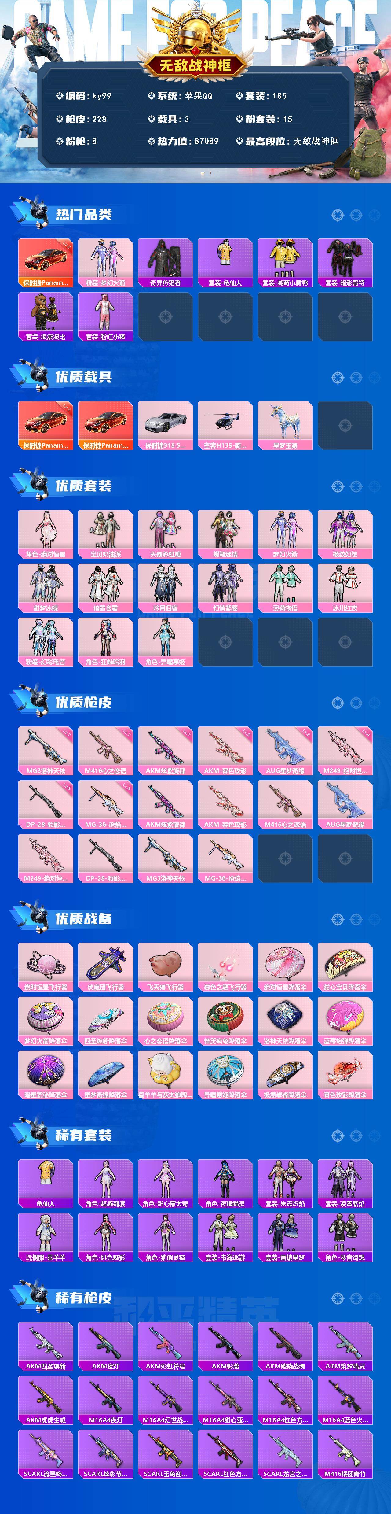 [16706596]苹果 手Q-无敌战神框-15粉装-8特效枪-3载具-5粉色飞行器-87089热力值-20王牌印记-185套装-228枪皮 【红色载具】:保时捷Panamera(炽焰橙)(二级) 【热门品类】:粉装-梦幻火箭,套装-奇异狩猎者,套装-龟仙人,套装-潮萌小黄鸭,套装-暗影哥特,套装-浪漫波比,套装-粉红小猪 【粉色套装】:角色-绝对恒星,粉装-宝贝奶油派,粉装-天使彩虹糖,粉装-蝶舞迷情,粉装-梦幻火箭,粉装-极致幻想,粉装-甜梦冰蝶,粉装-俏雪含霜,粉装-吟月归客,粉装-幻情紫藤,粉装-薄荷物语,粉装-冰川红玫,粉装-幻彩电音,角色-狂魅哈莉,角色-异瞳寒姬 【粉色枪皮等级】:AKM-炫紫旋律(七级),AKM-暮色玫影(三级),M416-心之恋语(七级),AUG-星梦奇缘(六级),M249-绝对恒星(四级),DP-28-豹影疾电(五级),MG3-洛神天依(七级),MG-36-沧焰双生(五级) 【粉色载具】:保时捷Panamera(炽焰橙),保时捷918 Spyder(液态银),空客H135-蔚蓝之翼,星梦玉骢 【粉色枪皮】:AKM-炫紫旋律,AKM-暮色玫影,M416-心之恋语,AUG-星梦奇缘,M249-绝对恒星,DP-28-豹影疾电,MG3-洛神天依,MG-36-沧焰双生 【粉色飞行器】:绝对恒星飞行器,伏魔团飞行器,飞天猪飞行器,暮色之舞飞行器 【粉色降落伞】:绝对恒星降落伞,甜心宝贝降落伞,梦幻火箭降落伞,四圣焕新降落伞,心之恋语降落伞,怪笑疯兔降落伞,洛神天依降落伞,蓝莓炮弹降落伞,暗星紫秘降落伞,星梦奇缘降落伞,喜羊羊与灰太狼降落伞,异瞳寒姬降落伞,极意拳锋降落伞,炫彩糖果降落伞,暮色玫影降落伞 【稀有套装】:套装-龟仙人,角色-超感刻度,角色-甜心蒙太奇,套装-雪国风尚,套装-炫彩糖果,角色-夜瞳黯灵,套装-朱霞炽焰,套装-凌霄紫焰,玩偶服-喜羊羊,角色-绯色魅影,角色-紫俏灵猫,套装-书海巡游,套装-画境星梦,套装-琴音绮想 【稀有枪皮】:AUG-冰晶雪宝,AKM-四圣焕新,AKM-夜灯,AKM-彩虹符号,AKM-影袭,AKM-破晓战魂,AKM-筑梦精灵,AKM-虎虎生威,M16A4-夜灯,M16A4-幻世战舞者,M16A4-甜心亚梦,M16A4-红色方程式,M16A4-蓝色火焰,SCAR-L-流星咚咚,SCAR-L-炫彩节奏,SCAR-L-玉兔迎春
