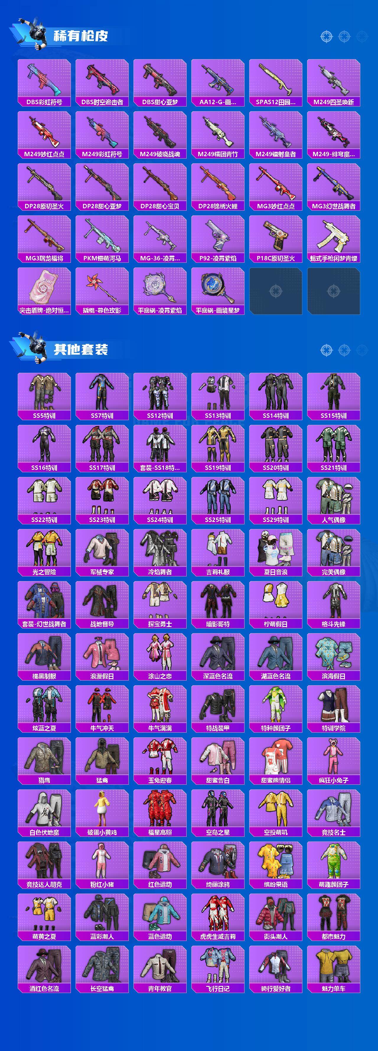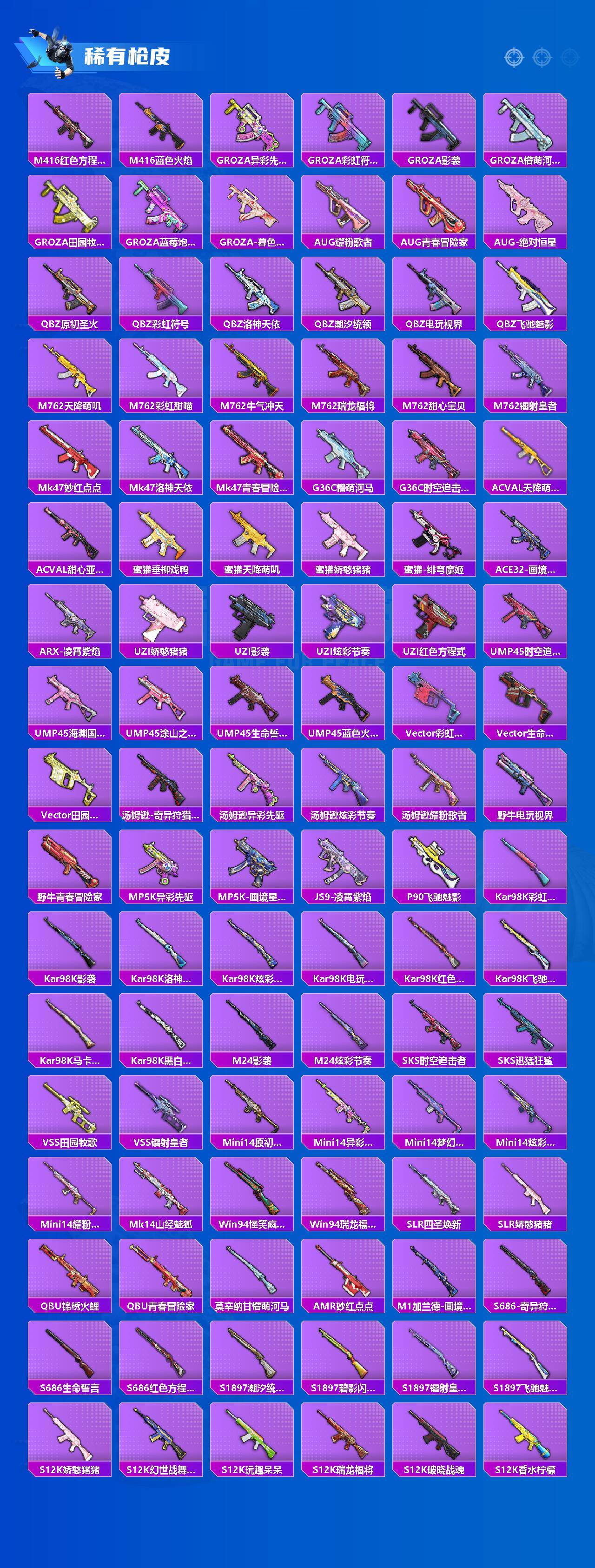 【稀有枪皮】:AUG-冰晶雪宝,AKM-四圣焕新,AKM-夜灯,AKM-彩虹符号,AKM-影袭,AKM-破晓战魂,AKM-筑梦精灵,AKM-虎虎生威,M16A4-夜灯,M16A4-幻世战舞者,M16A4-甜心亚梦,M16A4-红色方程式,M16A4-蓝色火焰,SCAR-L-流星咚咚,SCAR-L-炫彩节奏,SCAR-L-玉兔迎春