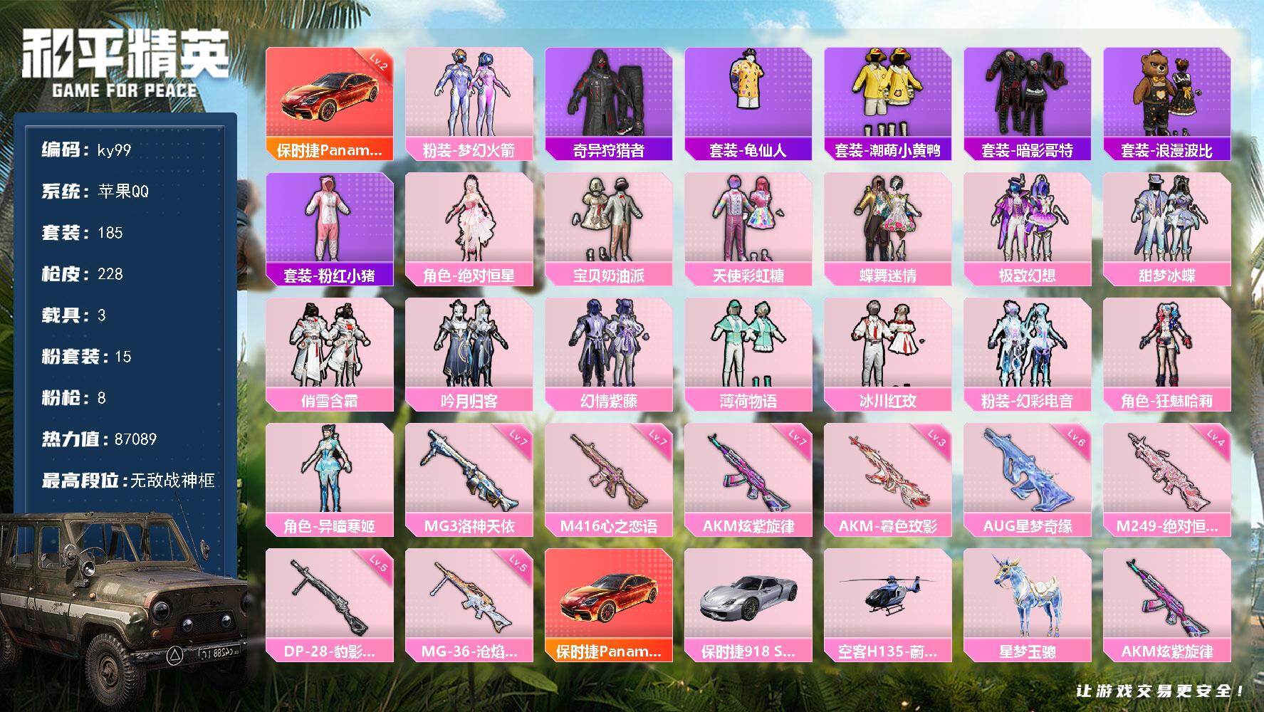[16706596]苹果 手Q-无敌战神框-15粉装-8特效枪-3载具-5粉色飞行器-87089热力值-20王牌印记-185套装-228枪皮