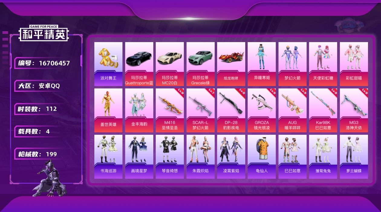 [16706457]安卓 手Q-6粉装-9特效枪-4载具-3粉色飞行器-62206热力值-14王牌印记-112套装-199枪皮