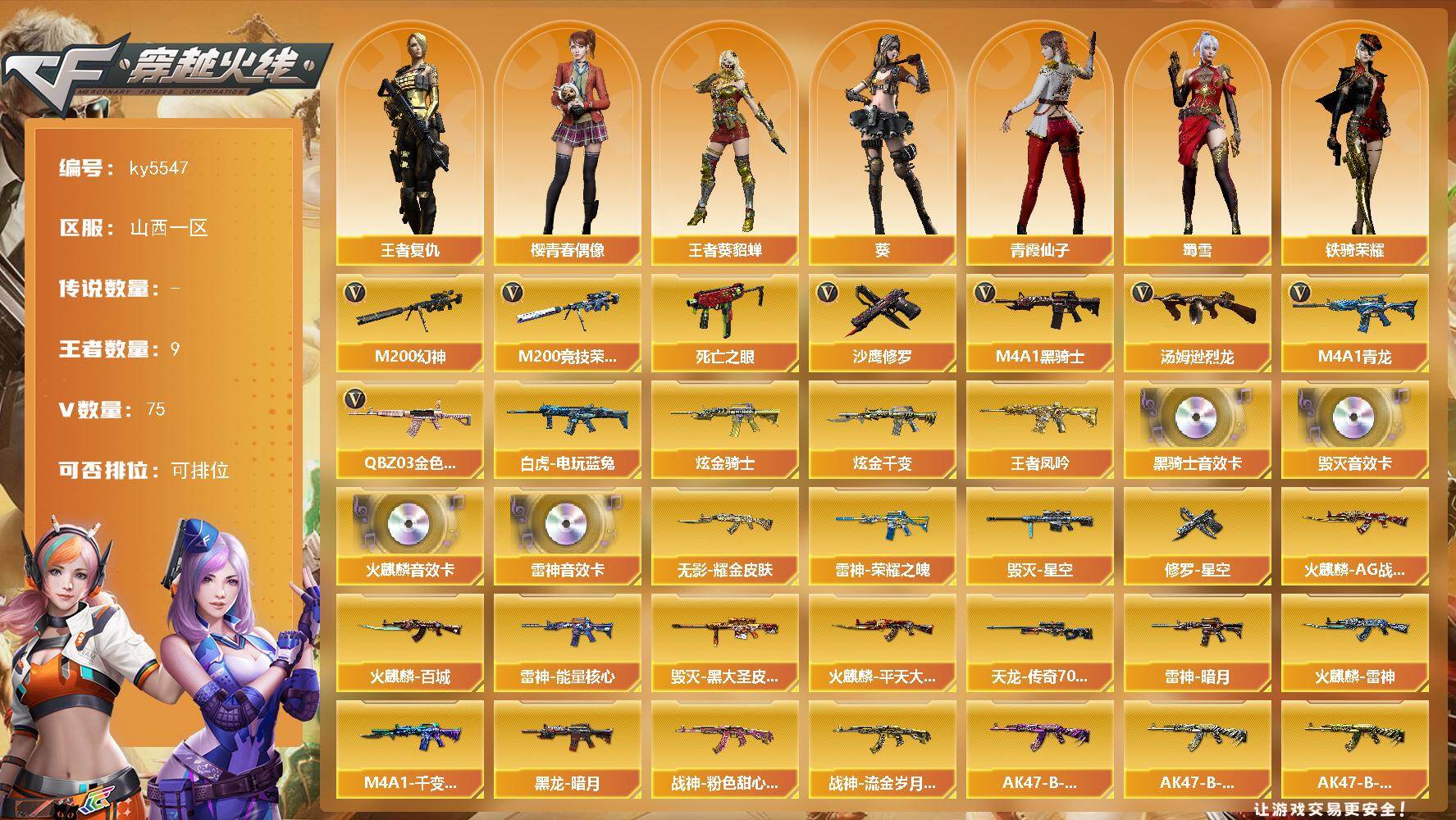 [16710111]山西一区-83V-9王者武器数-2炫金武器数 【热门武器】:QBZ03-金色蔷薇,M4A1-青龙,M200-幻神,M200-竞技荣光,死亡之眼*3,白虎-电玩蓝兔,M4A1-黑骑士,汤姆逊-烈龙,沙鹰-修罗*2 【王者炫金武器】:王者凤吟,炫金骑士,炫金千变 【音效卡】:AK47-火麒麟音效卡,M4A1-雷神音效卡,M4A1-黑骑士音效卡,Barrett-毁灭音效卡 【皮肤】:雷神-暗月,雷神-能量核心,雷神-荣耀之魄,火麒麟-AG战队皮肤,火麒麟-雷神,火麒麟-平天大圣,火麒麟-百城,毁灭-星空,毁灭-黑大圣皮肤,M4A1-千变-孔明皮肤,黑龙-暗月,无影耀金皮肤,战神-粉色甜心皮肤*2,战神-流金岁月皮肤*3,AK47-B-常胜将军-曹操,AK47-B-常胜将军-刘备*2,AK47-B-常胜将军-孙权*3,AWM-天龙-传奇70KG,极光-能量核心,修罗-能量核心*2,修罗-星空 【角色】:葵,王者-葵-貂蝉,王者复仇,暗夜-X,芳心审判者,风暴女,嘉年华灵狐,灵狐者-X,灵狐者-黄金海岸,灵狐者-七夕宝贝,龙儿,麻雀,潘多拉-X,潘多拉-甜心教官,潜龙队-X,青霞仙子,蜀雪,铁骑荣耀,新娜塔莎,樱-青春偶像,影武者-X 【人偶武器】:天龙-曼陀罗,AWM-灵狐-15周年嘉年华,M37-葵,闪光弹-貂蝉,高爆手雷-大乔,迷你超能女侍 【暴走生化】:死亡之眼*3 【英雄级武器】:AK47-火麒麟*2,M4A1-黑龙,M4A1-雷神,M4A1-黑骑士,AK47-无影,AK12-天启,M4A1-龙血,M4A1-青龙,M4A1-玫瑰精灵,QBZ03-金色蔷薇,王者之魄-觉醒版,王者之势-觉醒版,AK-47-猩红传说*4,AK47-B-战神,AK47-B-常胜将军,王者风势-觉醒版,白虎-电玩蓝兔,AWM-天龙,Barrett-毁灭,Barrett-极光,M200-幻神,Barrett-朱雀,M200-竞技荣光,汤姆逊-烈龙,沙鹰-修罗*2,沙鹰-天神*3,屠龙*3,龙啸,麒麟刺-堕天神,马来剑-夜魔,擎天,麒麟刺*3,擎天-竞技荣光,龙啸-堕天神,王者之锋-觉醒版,王者之啸-觉醒版*2,王者之击-觉醒版*2,高爆手雷-雷霆,高爆手雷-堕天神,高爆手雷-夜魔,高爆手雷-竞技荣光*5,闪光弹-雷霆,闪光弹-堕天神,闪光弹-夜魔,闪光弹-竞技荣光*5,烟雾弹-雷霆,烟雾弹-