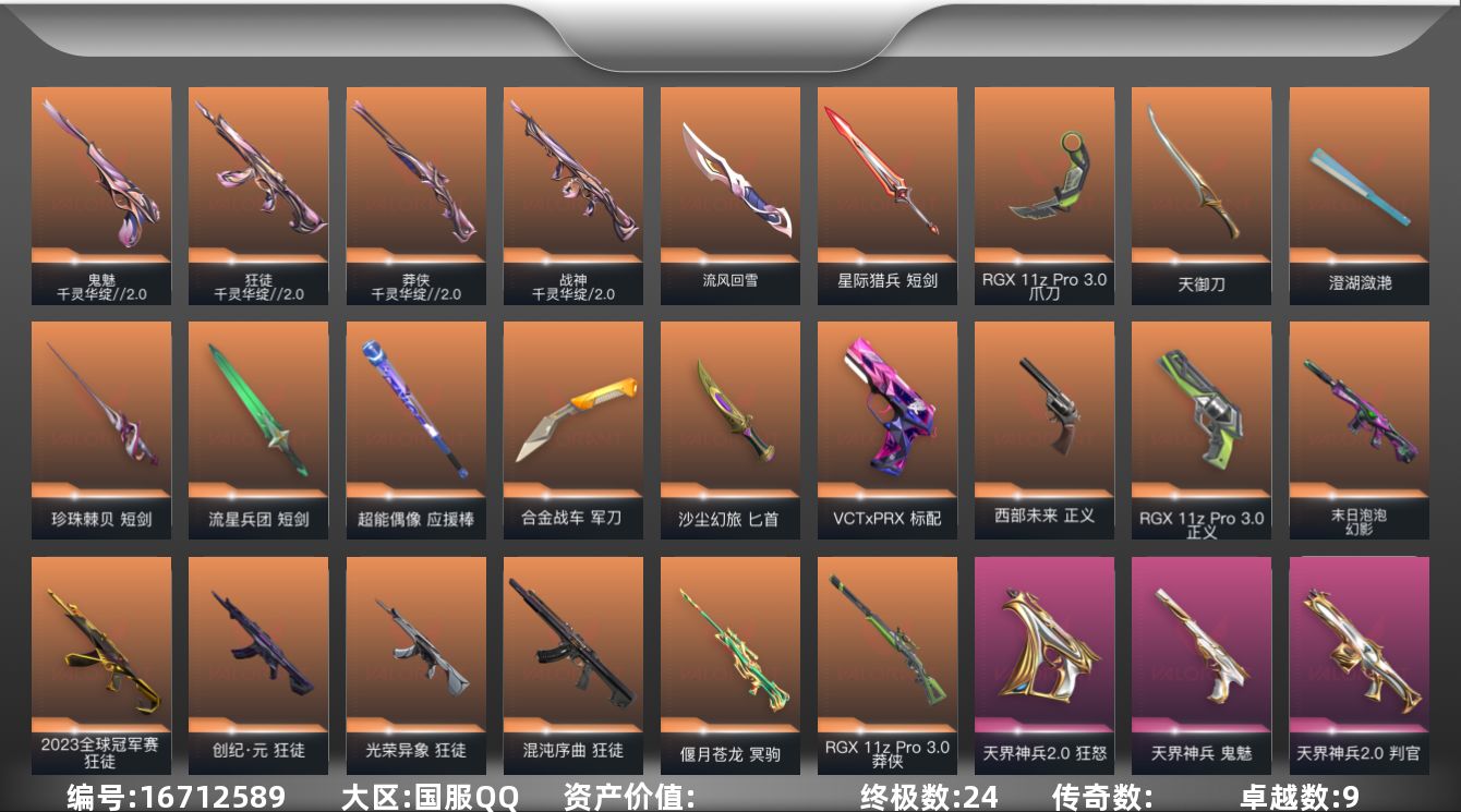 [16712589]【套装】:千灵华绽//2.0套装,RGX 11z Pro//3.0套装,天界神兵//2.0套装 【英雄】:幻棱,炼狱,维斯,暮蝶,钛狐,壹决,铁臂,捷风,雷兹,幽影,不死鸟,贤者,猎枭,蝰蛇,零,芮娜,奇乐,尚勃勒,霓虹,斯凯,夜露,星礈,K/O,海神,盖可,黑梦,钢锁 【近战武器】:近战武器-流风回雪,近战武器-RGX 11z Pro//3.0 爪刀,近战武器-澄湖潋滟,近战武器-珍珠棘贝 短剑,近战武器-流星兵团 短剑,近战武器-超能偶像 应援棒,近战武器-合金战车 军刀,近战武器-沙尘幻旅 匕首,近战武器-天御刀,近战武器-星际猎兵 短剑 【狂徒】:狂徒-2023全球冠军赛,狂徒-混沌序曲,狂徒-创·纪元,狂徒-光荣异象,狂徒-千灵华绽//2.0,狂徒-冰点凝冻,狂徒-堕天遗武,狂徒-盖亚的复仇,狂徒-超能偶像,狂徒-流星兵团,狂徒-沙尘幻旅 【幻影】:幻影-末日泡泡,幻影-天界神兵//2.0,幻影-合金战车,幻影-珍珠棘贝,幻影-聚合之力 【戍卫】:戍卫-超能偶像,戍卫-珍珠棘贝,戍卫-花漾粉红,戍卫-萌彩剪影,戍卫-战术熊与伙伴们 【獠犬】:獠犬-采蜜小蜂队,獠犬-复古浪潮,獠犬-胡桃狂想,獠犬-数码咒术 【冥驹】:冥驹-偃月苍龙,冥驹-堕天遗武,冥驹-复古浪潮,冥驹-胡桃狂想,冥驹-花漾粉红 【飞将】:飞将-合金战车,飞将-沙尘幻旅,飞将-聚合之力,飞将-战术熊与伙伴们 【莽侠】:莽侠-RGX 11z Pro//3.0,莽侠-千灵华绽//2.0,莽侠-深海水族,莽侠-纤云弄巧 【战神】:战神-千灵华绽//2.0,战神-采蜜小蜂队,战神-萌彩剪影,战神-深海水族,战神-数码咒术 【奥丁】:奥丁-天界神兵//2.0,奥丁-流星兵团 【判官】:判官-天界神兵//2.0,判官-超能偶像,判官-采蜜小蜂队,判官-萌彩剪影,判官-数码咒术 【雄鹿】:雄鹿-复古浪潮 【骇灵】:骇灵-流星兵团,骇灵-沙尘幻旅,骇灵-珍珠棘贝,骇灵-花漾粉红 【蜂刺】:蜂刺-合金战车,蜂刺-胡桃狂想,蜂刺-聚合之力,蜂刺-深海水族,蜂刺-纤云弄巧 【标配】:标配-超能偶像,标配-战术熊与伙伴们 【VCT手枪】:标配-VCT x PRX 【正义】:正义-RGX 11z Pro//3.0,正义-西部未来,正义-合金战车,正义-沙尘幻旅,正义-复古浪潮,正义-纳米打击,正义-纤云弄巧,正义-