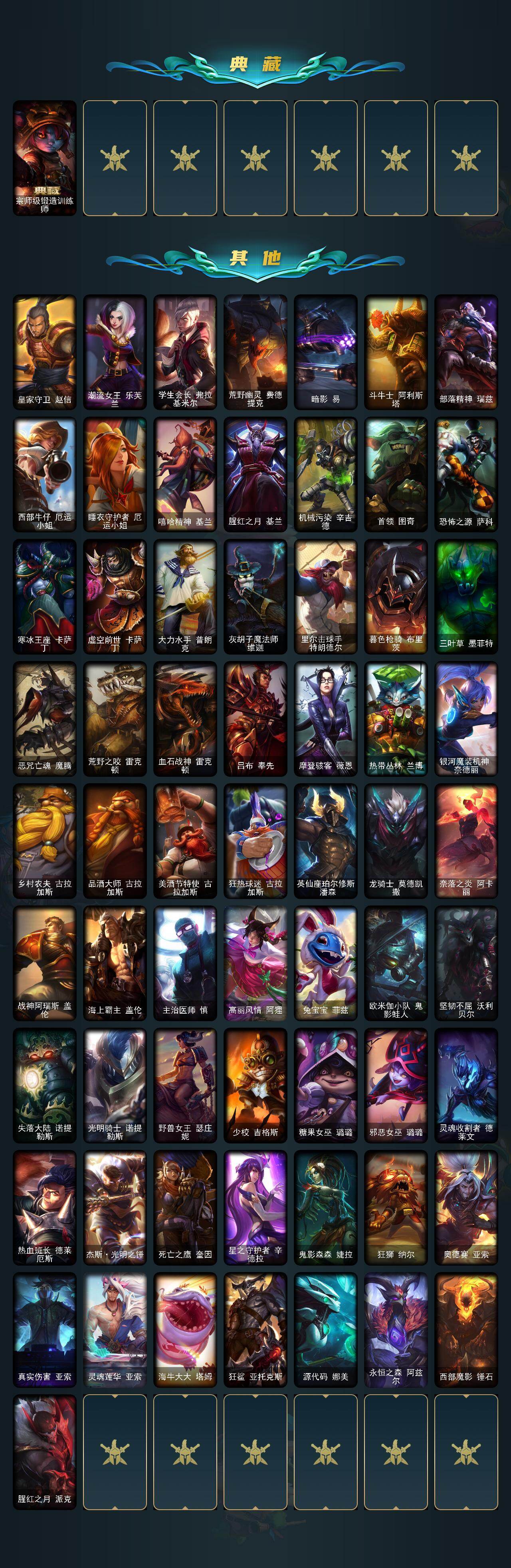 【其他皮肤1】:皇家守卫赵信,潮流女王乐芙兰,学生会长弗拉基米尔,荒野幽灵费德提克,暗影易,斗牛士阿利斯塔,部落精神瑞兹,西部牛仔厄运小姐,睡衣守护者厄运小姐,嘻哈精神基兰,腥红之月基兰,机械污染辛吉德,首领图奇,恐怖之源萨科,寒冰王座卡萨丁,虚空前世卡萨丁,大力水手普朗克,灰胡子魔法师维迦,里尔击球手特朗德尔,暮色枪骑布里茨,三叶草墨菲特,恶咒亡魂魔腾,荒野之咬雷克顿,血石战神雷克顿,吕布奉先,摩登骇客薇恩,热带丛林兰博,银河魔装机神奈德丽,乡村农夫古拉加斯,品酒大师古拉加斯,美酒节特使古拉加斯,狂热球迷古拉加斯,英仙座珀尔修斯潘森,龙