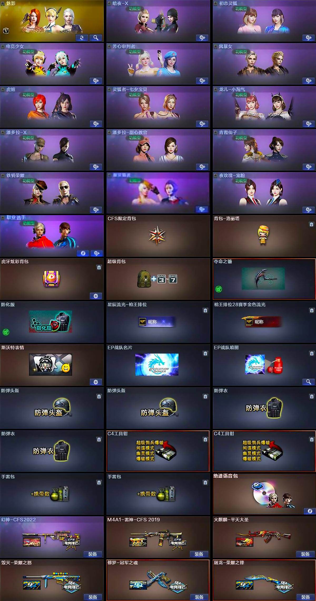 【道具】:CFS限定背包,背包-洛丽塔,虎牙炫彩背包,超级背包,哔哩哔哩名片,夺命之镰,防化服,星辰流光-枪王排位,枪王排位28赛季金色流光,斯沃特表情,EP战队名片,EP战队喷图,防弹头盔*2,防弹衣*2,C4工具钳*2,手雷包*2