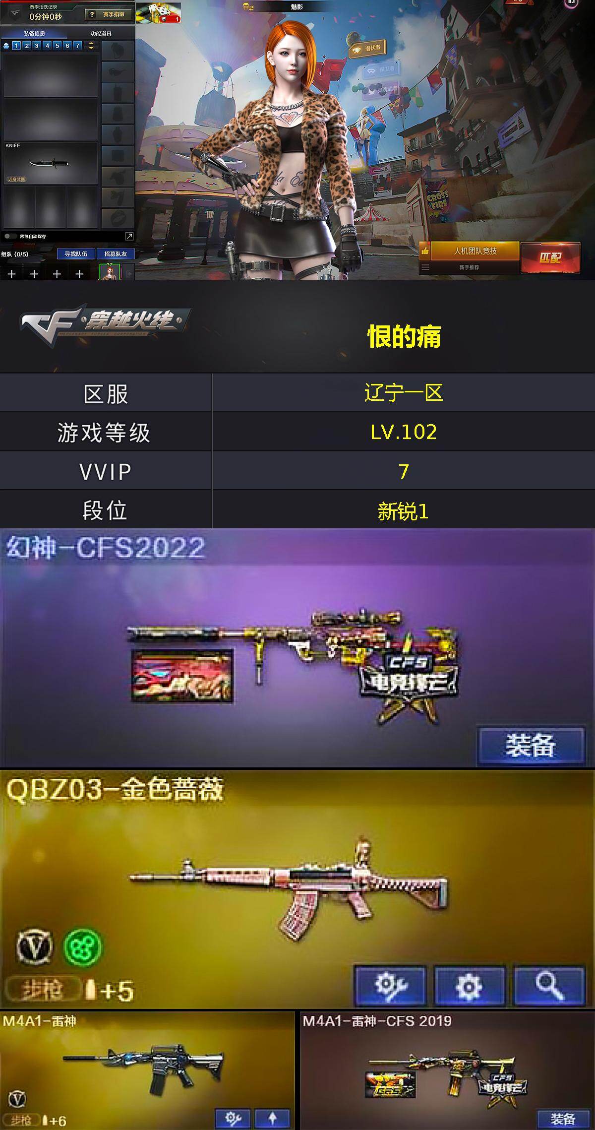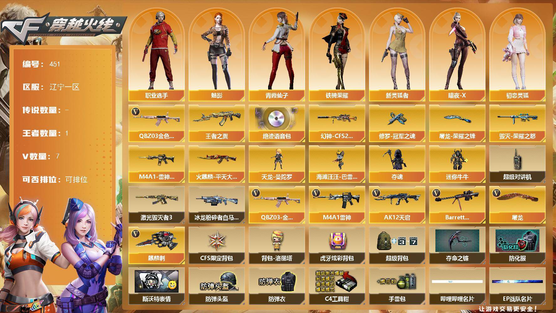 [16715799]辽宁一区-7V-1王者武器数-0炫金武器数 【热门武器】:QBZ03-金色蔷薇 【王者炫金武器】:王者之翼 【音效卡】:绝迹语音包 【皮肤】:幻神-CFS2022,M4A1-雷神-CFS 2019,火麒麟-平天大圣,毁灭-荣耀之怒,修罗-冠军之魂,屠龙-荣耀之锋 【角色】:魅影,暗夜-X,初恋灵狐,电竞少女,芳心审判者,风暴女,虎妞,0号玩家,灵狐者-七夕宝贝,龙儿-小淘气,潘多拉-X,潘多拉-甜心教官,青霞仙子,铁骑荣耀,新灵狐者,夜玫瑰-宠粉,职业选手 【人偶武器】:天龙-曼陀罗,海滩汪汪-巴雷特,夺魂,迷你牛牛 【暴走生化】:超级对讲机 【挑战大师】:冰龙粉碎者-白马银枪,激光毁灭者III 【英雄级武器】:M4A1-雷神,AK12-天启,QBZ03-金色蔷薇,Barrett-毁灭,屠龙,麒麟刺 【道具】:CFS限定背包,背包-洛丽塔,虎牙炫彩背包,超级背包,哔哩哔哩名片,夺命之镰,防化服,星辰流光-枪王排位,枪王排位28赛季金色流光,斯沃特表情,EP战队名片,EP战队喷图,防弹头盔*2,防弹衣*2,C4工具钳*2,手雷包*2 【特殊枪械】: