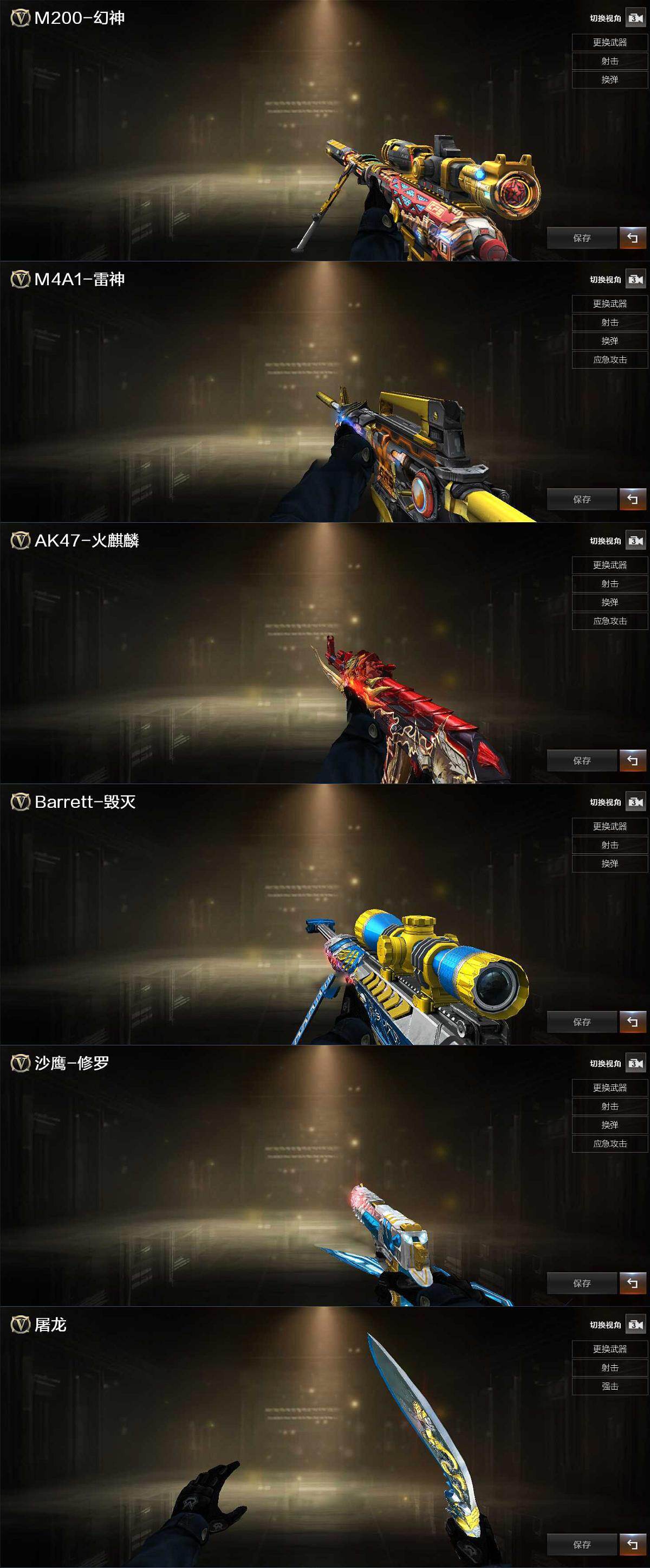 【皮肤】:幻神-CFS2022,M4A1-雷神-CFS 2019,火麒麟-平天大圣,毁灭-荣耀之怒,修罗-冠军之魂,屠龙-荣耀之锋