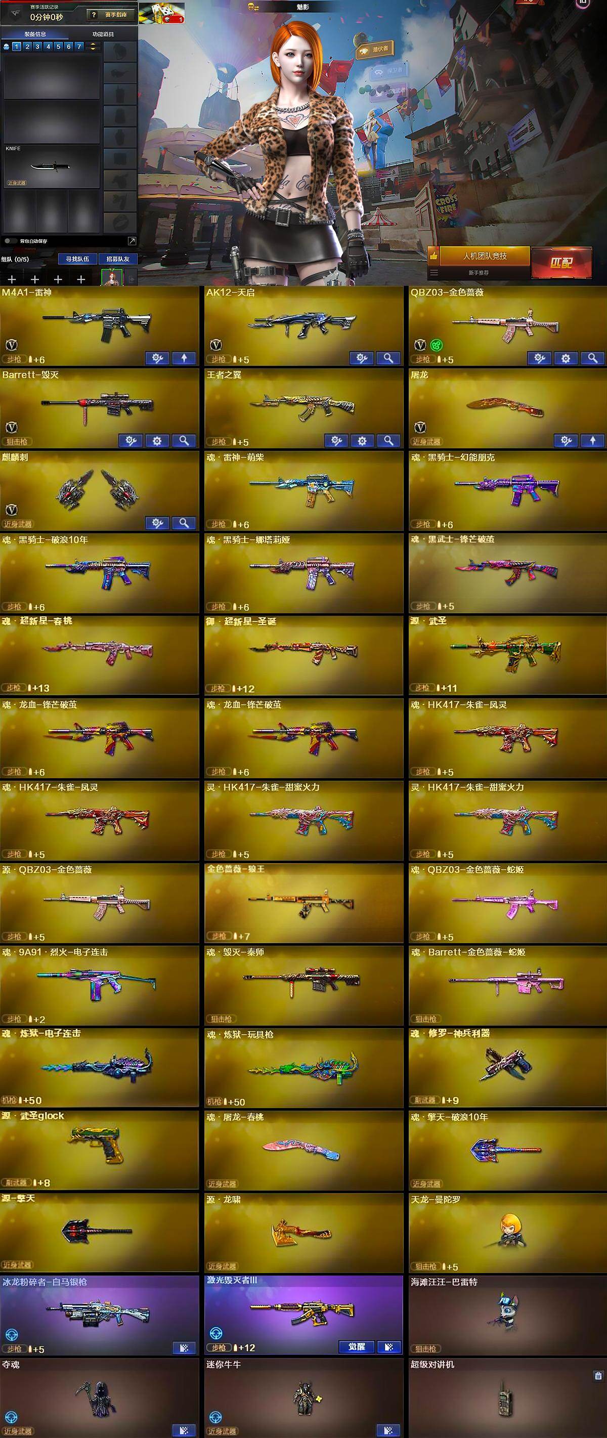 - [16335325]浙江一区-70V-9王者-0炫金 【热门武器】:QBZ03-金色蔷薇,Scar Light-白虎,M200-幻神,M200-竞技荣光,死亡之眼,白虎-电玩蓝兔,Kar98K-星神,金色小号,M4A1-黑骑士,汤姆逊-烈龙*2,雷神-小红,COP-白鲨,USP-雷暴,COP 357-幻灵,沙鹰-修罗*2,金刚伞 【王者炫金武器】:王者凤吟 【音效卡】:擎天-云海游龙音效卡,AN94-超新星-热带奇洋音效卡,M200-幻神音效卡,M4A1-黑骑士音效卡,Kar98K-星神音效卡,女战神梧桐语音包 【皮肤】:M200-幻神-黄忠皮肤,幻神-宠儿-2021MVP,幻神-星耀 皮肤,幻神-荣耀世冠EP 皮肤,白虎-热带奇洋 皮肤,金色蔷薇-枪娘阿敏 皮肤,金色蔷薇-热带奇洋 皮肤,QBZ03-荣耀世冠EP 皮肤,雷神-冠军之魄,火麒麟-荣耀世冠AG,火麒麟-心动糖果,毁灭-直播专属,M4A1-千变-孔明皮肤,黑骑士-电玩青兔皮肤,超新星-深海萌鲨 皮肤,AK47-B-常胜将军-刘备,炼狱-星空,屠龙-荣耀世冠AG,屠龙-星耀 皮肤*2,擎天-冠军之击 【角色】:雨棠,鹰,星际战将,王者潘多拉,奇洋探员,修道士,云海玲珑,芳心审判者,嘉年华灵狐,龙儿,麻雀,女主播,潘多拉-X,蛇姬,斯沃特-X,铁骑荣耀,维纳斯,夜玫瑰-宠粉,樱-战斗天使,樱-缤纷夏日,游珑儿 【人偶武器】:雷神-小红,COP-白鲨,AWM-灵狐-15周年嘉年华*2,迷你超能女侍 【暴走生化】:死亡之眼 【挑战大师】:激光毁灭者III-白马银枪,激光毁灭者III,KAC-圣炎切割者III 【英雄级武器】:M4A1-千变,AK47-火麒麟*2,M4A1-雷神,M4A1-黑骑士,AN94-超新星,Scar Light-白虎,无影-神兵利器,黑武士-锦绣游龙,超新星-热带奇洋,M4A1-玫瑰精灵,QBZ03-金色蔷薇,AK-47-猩红传说*2,AK47-B-战神*2,王者白虎-觉醒版,白虎-电玩蓝兔,王者芳薇-觉醒版,AWM-天龙,Barrett-毁灭,Barrett-极光,M200-幻神,Kar98K-星神,M200-竞技荣光,汤姆逊-烈龙*2,烈龙-云海游龙,沙鹰-修罗*2,沙鹰-天神,USP-雷暴,COP-雷霆,COP 357-幻灵,柯尔特-荣耀世冠EP*2,屠龙,龙啸,擎天,麒麟刺,幻灵之锋*3,擎天-云海