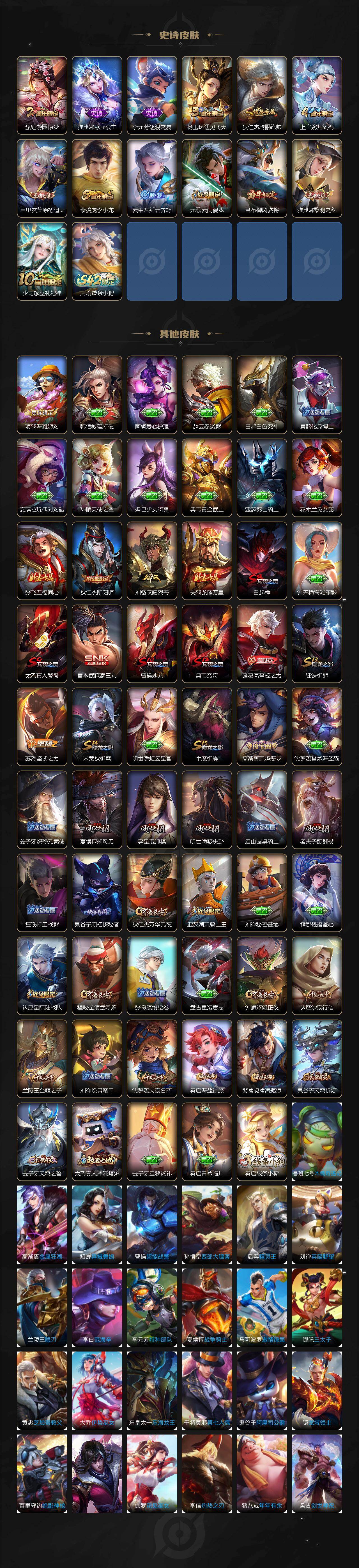 【史诗皮肤】:阿轲暗夜猫娘,赵云皇家上将,赵云未来纪元,王昭君偶像歌手,狄仁杰魔术师,孙尚香水果甜心,嬴政摇滚巨星,妲己魅力维加斯,墨子金属风暴,曹操幽灵船长,李白千年之狐,张飞乱世虎臣,甄姬游园惊梦,雅典娜冰冠公主,李元芳逐浪之夏,杨玉环遇见飞天,狄仁杰鹰眼统帅,上官婉儿梁祝,百里玄策原初追逐者,裴擒虎李小龙,云中君纤云弄巧,元歌云间偶戏,吕布御风骁将,雅典娜黎明之约,少司缘巫礼祀神,周瑜线条小狗