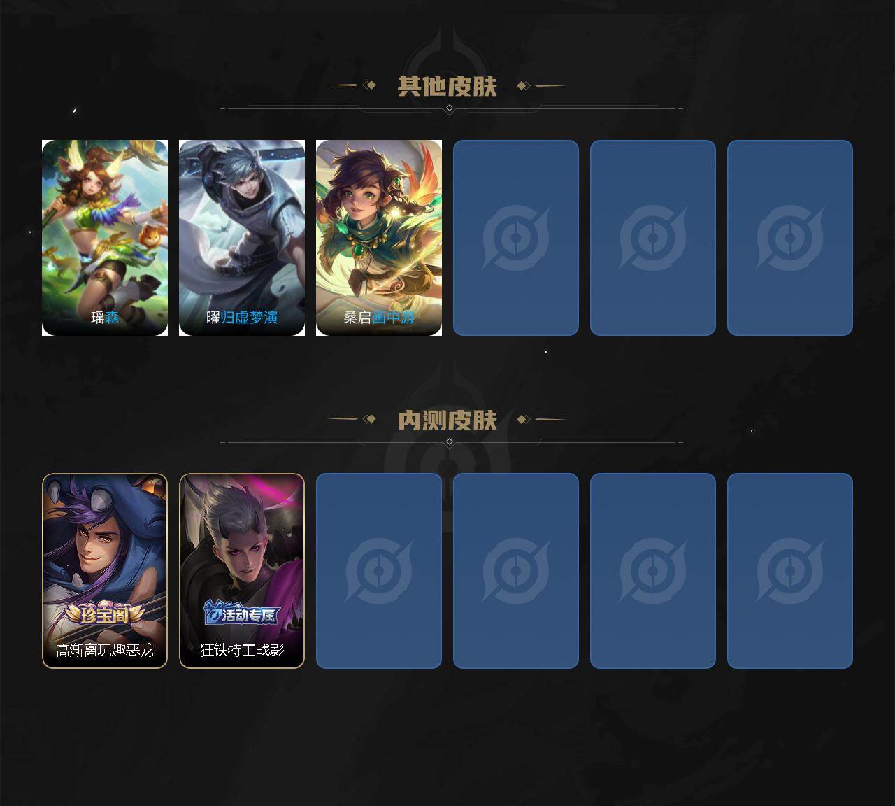 白起狰,太乙真人饕餮,曹操烛龙,典韦穷奇,狂铁御狮,米莱狄御霄,牛魔御旌,夏侯惇朔风刀,明世隐疑决卦,老夫子醍醐杖,鬼谷子原初探秘者,狄仁杰万华元夜,程咬金演武夺筹,钟馗驱傩正仪,元歌云间偶戏,弈星混沌棋,达摩沙漠行僧,兰陵王金庭之子,沈梦溪大漠名商,桑启海盐诗旅,裴擒虎擒涛扼浪