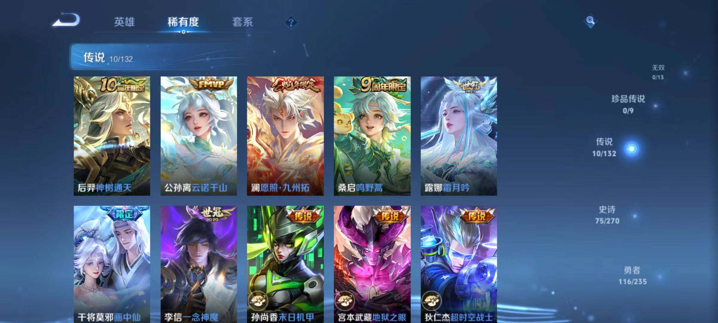 【传说皮肤】:后羿神树通天,公孙离云诺千山,澜愿照九州拓,桑启鸣野蒿,露娜霜月吟,干将莫邪画中仙,李信一念神魔,孙尚香末日机甲,宫本武藏地狱之眼,狄仁杰超时空战士