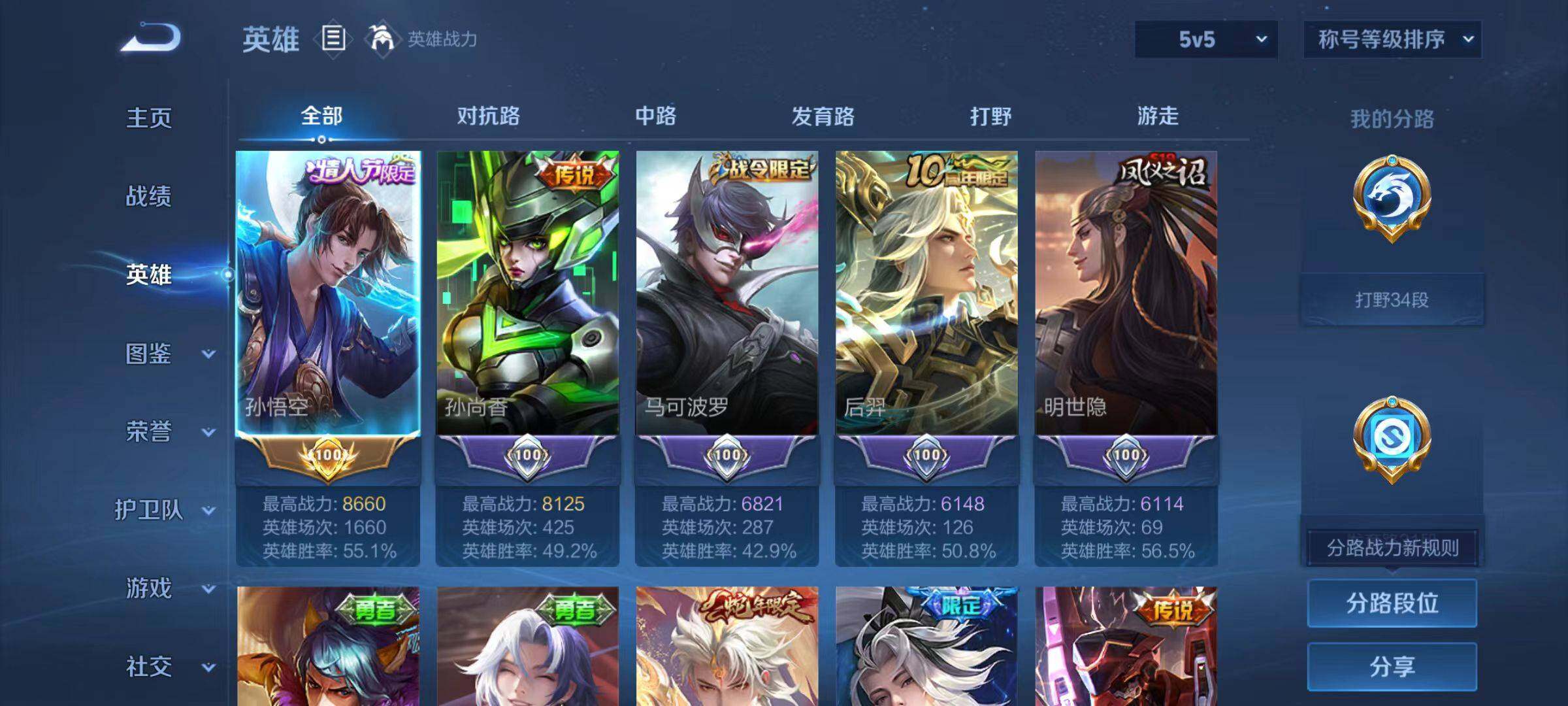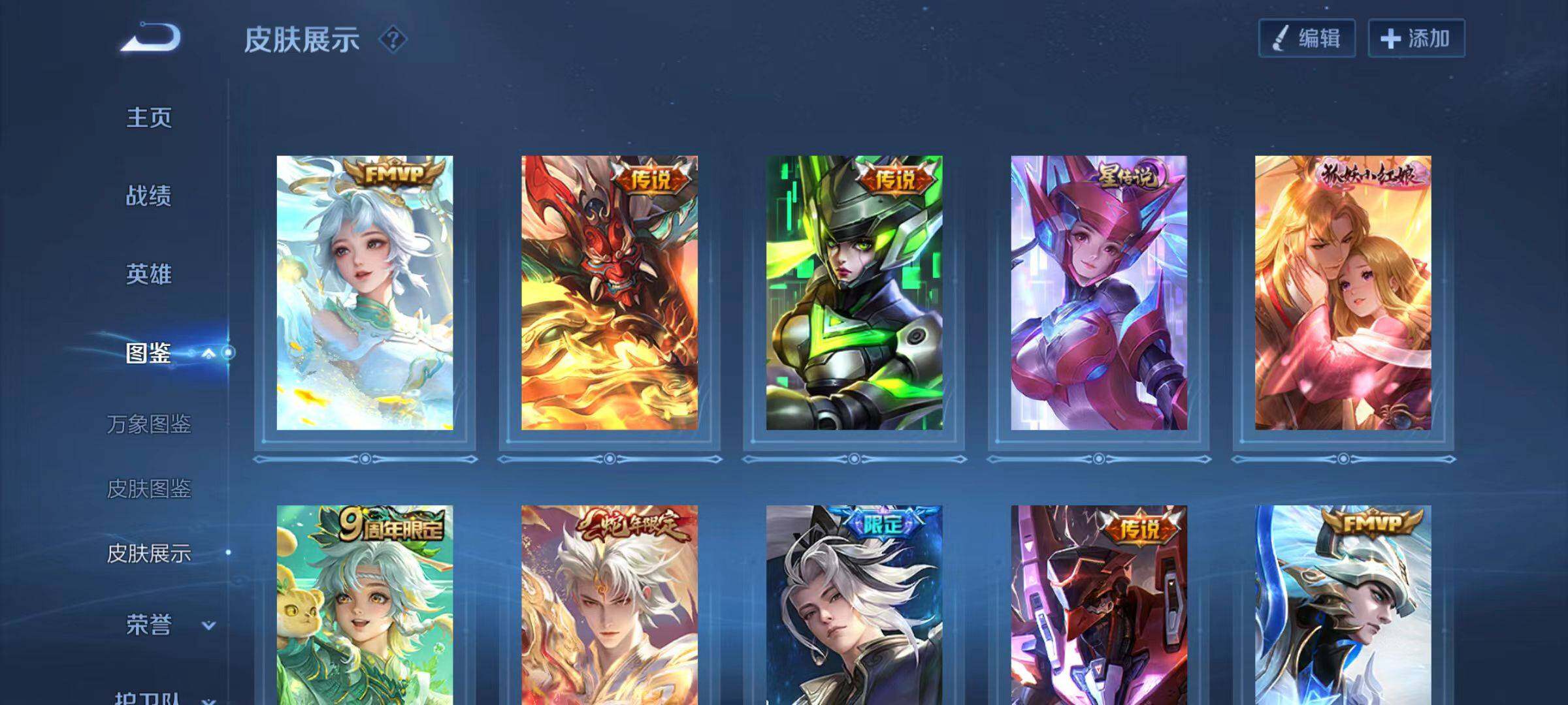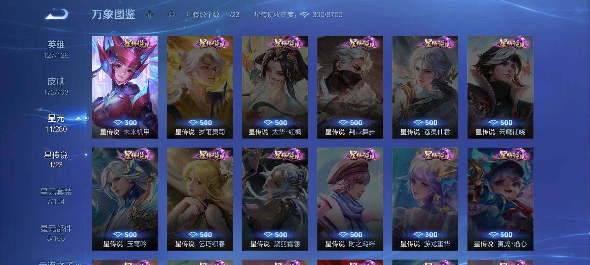 【史诗皮肤】:鲁班七号电玩小子,阿轲暗夜猫娘,赵云皇家上将,王昭君偶像歌手,狄仁杰魔术师,廉颇地狱岩魂,宫本武藏鬼剑武藏,孙尚香水果甜心,吕布圣诞狂欢,曹操幽灵船长,张飞乱世虎臣,孙悟空至尊宝,花木兰水晶猎龙者,亚瑟心灵战警,雅典娜冰冠公主,安琪拉心灵骇客,百里守约特工魅影,蔡文姬舞动绿茵,李元芳逐浪之夏,程咬金功夫厨神,孙悟空大圣娶亲,伽罗箭羽风息,狄仁杰鹰眼统帅,蔡文姬繁星吟游,李元芳银河之约,小乔青蛇,马可波罗暗影游猎,百里玄策原初追逐者,裴擒虎李小龙,云中君纤云弄巧,百里玄策热力回旋,司马懿暗渊魔法,姬小满妄想食味,蒙犽顽岩魄,暃埋骨钱,亚连破空之剑,李白谪仙醉月,牛魔星界战将,狄仁杰绮世丹青,刘禅鸭鸭历险记,狂铁龙之律动,百里守约雪豹霜爪,周瑜百相守梦,黄忠百相守梦