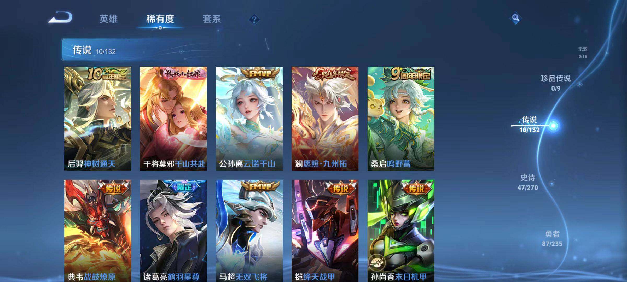 【传说皮肤】:后羿神树通天,干将莫邪千山共赴,公孙离云诺千山,澜愿照九州拓,桑启鸣野蒿,典韦战鼓燎原,诸葛亮鹤羽星尊,马超无双飞将,铠绛天战甲,孙尚香末日机甲