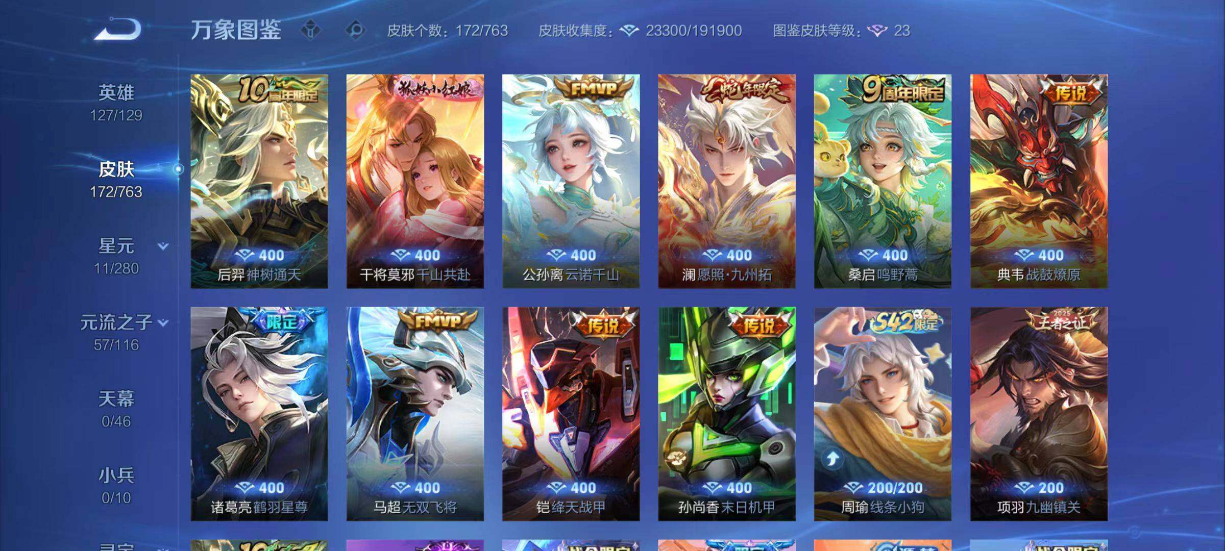 【限定皮肤】:暃埋骨钱,蒙犽顽岩魄,姜子牙天穹之誓,李白谪仙醉月,狄仁杰阴阳师,赵云皇家上将,高渐离死亡摇滚,芈月重明,典韦穷奇,马可波罗暗影游猎,狄仁杰魔术师,狄仁杰万华元夜,达摩沙漠行僧,项羽海滩派对,老夫子醍醐杖,孙悟空至尊宝,孙悟空大圣娶亲,李元芳银河之约,李元芳云中旅人,钟馗驱傩正仪,蔡文姬繁星吟游,鬼谷子原初探秘者,诸葛亮鹤羽星尊,百里玄策原初追逐者,沈梦溪大漠名商,明世隐疑决卦,裴擒虎李小龙,狂铁御狮,云中君纤云弄巧,猪八戒西部大镖客,姬小满妄想食味,李元芳蔬乡物语,刘邦剑破天穹,项羽苍威无极,周瑜熔金海岸