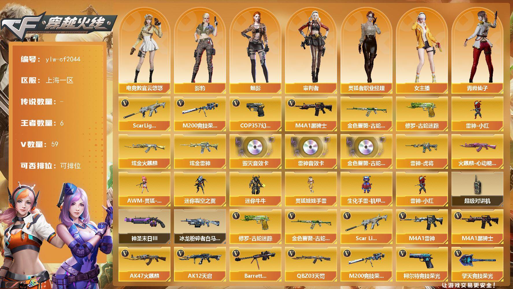 [16539371]上海一区-59V-6王者-2炫金 【热门武器】:Scar Light-白虎,金色蔷薇-古蛇迷踪,修罗-古蛇迷踪,M200-竞技荣光,M4A1-黑骑士,雷神-小红,COP 357-幻灵*3 【王者炫金武器】:炫金火麒麟,炫金雷神 【音效卡】:金色蔷薇-古蛇迷踪音效卡,M4A1-雷神音效卡,Barrett-毁灭音效卡 【稀有皮肤】:雷神-虎将,火麒麟-心动糖果 【角色】:灵狐者-职业经理,电竞教官-云悠悠,影豹,魅影,审判者,女主播,青霞仙子 【人偶武器】:雷神-小红,AWM-灵狐-15周年嘉年华*2,迷你裂空之翼,迷你牛牛,灵狐娃娃手雷*2,生化手雷-机甲核心 【暴走生化】:超级对讲机 【挑战大师】:神圣爆裂者-末日III,冰龙粉碎者-白马银枪 【英雄级武器】:M200-竞技荣光,柯尔特-竞技荣光*2,擎天-竞技荣光,高爆手雷-竞技荣光*2,烟雾弹-竞技荣光*2,闪光弹-竞技荣光*2,M4A1-幻灵,COP 357-幻灵*3,幻灵之锋*2,马来剑-夜魔,斩神刀-雷暴,Scar Light-白虎,金色蔷薇-古蛇迷踪,无影-神兵利器,M4A1-雷神,M4A1-黑骑士,AK47-火麒麟,AK12-天启,Barrett-毁灭,QBZ03-天罚,黑武士-锦绣游龙,M4A1-赤狱骑士,修罗-古蛇迷踪 【特殊枪械】:1白虎,1黑骑士