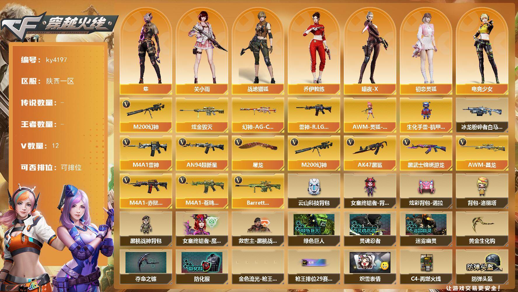 [16438942]陕西一区-12V-0王者-1炫金 【热门武器】:M200-幻神 【王者炫金武器】:炫金毁灭 【皮肤】:幻神-AG-CFPL S24冠军 皮肤,雷神-R.LGD-CFPLS18冠军 【角色】:关小雨,隼,战地猎狐,乔伊教练,暗夜-X,初恋灵狐,电竞少女,飞虎队-X,兰妹妹,兔囡囡,游珑儿 【人偶武器】:AWM-灵狐-15周年嘉年华,生化手雷-机甲核心 【挑战大师】:冰龙粉碎者-白马银枪 【英雄级武器】:M4A1-雷神,AN94-超新星,AK47-黑鲨,黑武士-锦绣游龙,M200-幻神,屠龙,M4A1-赤狱骑士,M4A1-苍鸣雷神,AWM-昌龙,Barrett-碧霄极光 【道具】:云山科技背包,女皇终结者-背包,炫彩背包-诺拉,背包-洛丽塔,黑桃战神背包,女皇终结者-魔龙之吻,救世主-黑桃战神,黄金生化钩,绿色巨人,灵魂忍者,迷雾幽灵,夺命之镰,防化服*3,金色流光-枪王排位,星辰流光-枪王排位,枪王排位28赛季金色流光,枪王排位29赛季金色流光,炽雪表情,C4-再燃火线,防弹头盔*3,防弹衣*3,C4工具钳*3,手雷包*3 【特殊枪械】: