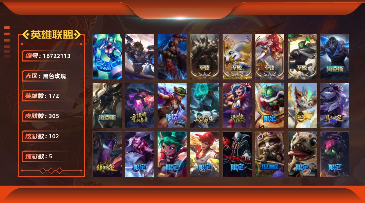 [16722113]可二次【特价出售/店主推荐】黄金段位-172英雄-305皮肤-102炫彩-3终极-11神话-55限定-29传说-73史诗