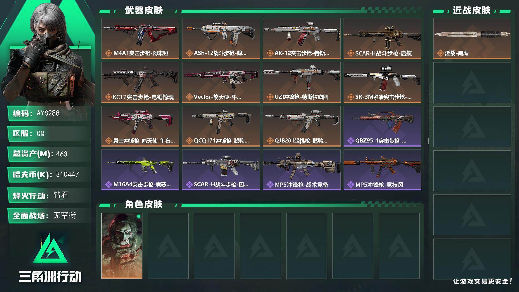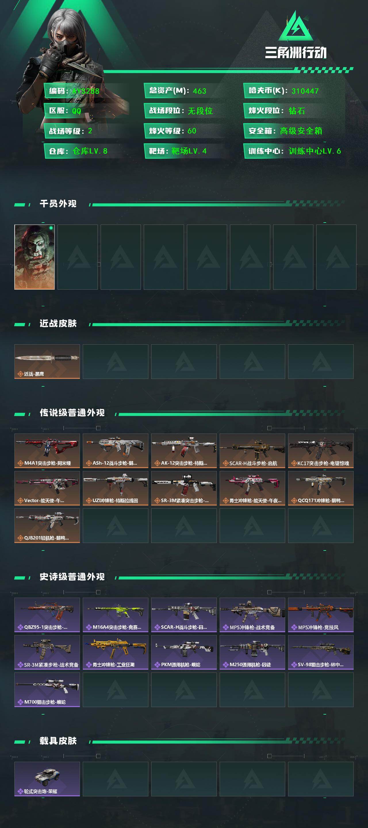 [16710848]【纯资产账号特价出售/店主推荐】463m总资产-310447k哈伏币-60烽火等级-钻石-2战场等级-无军衔 【干员外观】:红狼-电锯惊魂 【近战皮肤】:近战-黑鹰 【传说外观】:M4A1突击步枪-阿米娅,ASh-12战斗步枪-鹅鸭杀,AK-12突击步枪-特斯拉线圈,SCAR-H战斗步枪-启航,KC17突击步枪-电锯惊魂,Vector冲锋枪-能天使-午夜邮差,UZI冲锋枪-特斯拉线圈,SR-3M紧凑突击步枪-特斯拉线圈,勇士冲锋枪-能天使-午夜邮差,QCQ171冲锋枪-鹅鸭杀,QJB201轻机枪-鹅鸭杀 【史诗外观】:QBZ95-1突击步枪-曙光,M16A4突击步枪-竞赛选手,SCAR-H战斗步枪-囚徒,MP5冲锋枪-战术竞备,MP5冲锋枪-竞技风,SR-3M紧凑突击步枪-战术竞备,勇士冲锋枪-工业狂潮,PKM通用机枪-蝮蛇,M250通用机枪-囚徒,SV-98狙击步枪-林中猎手,M700狙击步枪-蝮蛇 【稀有外观】:AUG突击步枪-花岗岩,MP7冲锋枪-黑潮,K437突击步枪-巨兽,AKM突击步枪-肃杀,QBZ95-1突击步枪-公平竞技,M7战斗步枪-捣蛋鬼,SCAR-H战斗步枪-荣耀列队,腾龙突击步枪-冰天雪地,MP5冲锋枪-弄臣,MP5冲锋枪-虎啸,MP5冲锋枪-哈夫克卫队,P90冲锋枪-黄昏,P90冲锋枪-捣蛋鬼,Vector冲锋枪-先锋,UZI冲锋枪-前沿科技,UZI冲锋枪-亚特兰蒂斯,野牛冲锋枪-前沿科技,SMG-45-行动开启,SMG-45冲锋枪-幻影结构,勇士冲锋枪-冰天雪地,M1014霰弹枪-幻影结构,M249轻机枪-毛鲁斯之力,QJB201轻机枪-哈夫克卫队,Mini-14射手步枪-荣耀列队,SKS射手步枪-弄臣,SR-25射手步枪-开拓,SR-9射手步枪-街头涂鸦,SV-98狙击步枪-星链科技,SV-98狙击步枪-哈夫克航天,SV-98狙击步枪-精英联盟,G18-前沿科技,G18-星链科技,G18-哈夫克航天 【普通外观】:.357左轮-淘金者,M14射手步枪-蛇纹涂装,M249轻机枪-蝴蝶,PKM通用机枪-黄铜,.357左轮-黄铜,G18-马赛克涂装,S12K霰弹枪-监察,R93狙击步枪-凶兽,AS Val突击步枪-猛兽,SVD狙击步枪-猛兽,PTR-32突击步枪-噬菌体,M4A1突击步枪-粉色涂装,M4A1突击步枪-高雅黑,M4A1突击步枪