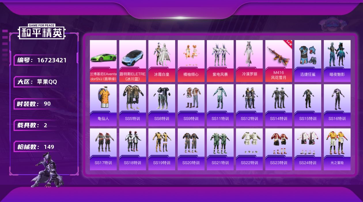 [16723421]【特价出售/店主推荐】苹果 手Q-4粉装-1特效枪-2载具-1粉色飞行器-46095热力值-1王牌印记-90套装-149枪皮【热门品类】:套装-龟仙人【粉色套装】:粉装-冰霜白皇,粉装-橘柚倾心,粉装-紫电风暴,角色-冷漠罗丽【粉色枪皮等级】:M416-风花雪月(六级)【粉色载具】:兰博基尼Aventador SVJ(翡翠绿),路特斯ELETRE(冰川蓝)【粉色枪皮】:M416-风花雪月【粉色飞行器】:星夜魔法师飞行翼